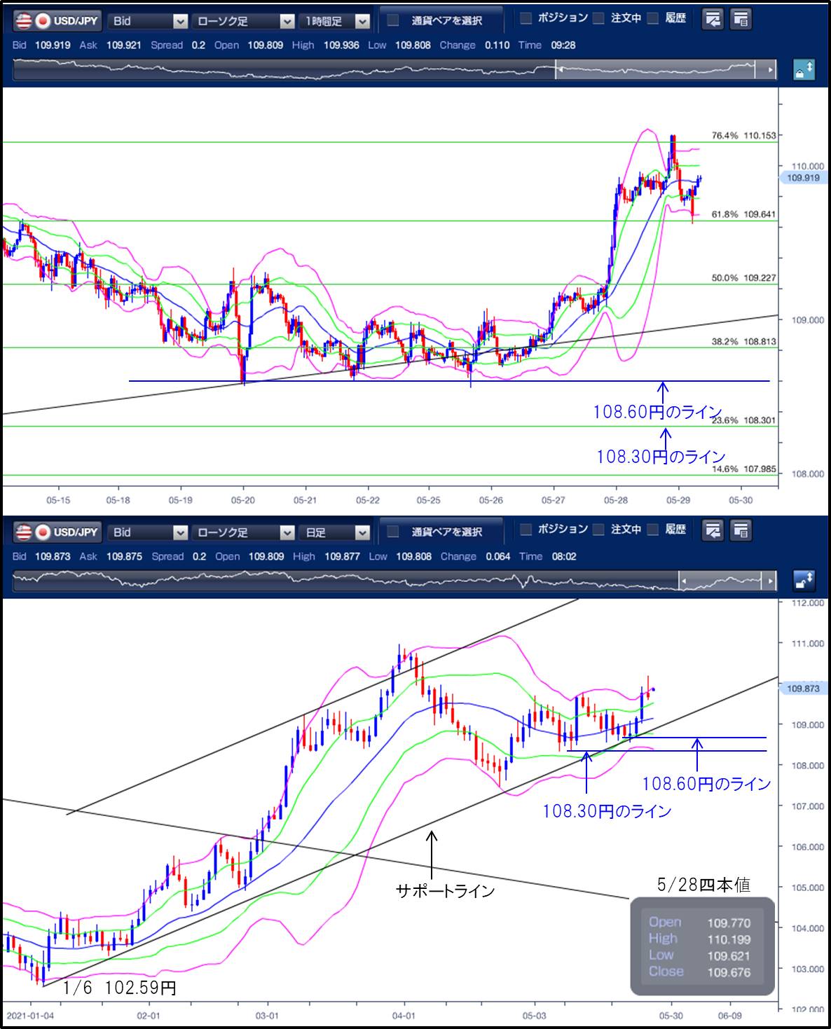ただし、110円台では戻り売り意欲が強いことや利食いのドル売りが入ったこと、本日(5/31)は米国と英国が休場のため、3連休を控えたポジション調整によるドル売りが観測されたことで急落し、109.74円の安値をつけました。NYクローズは109.67円となりました。