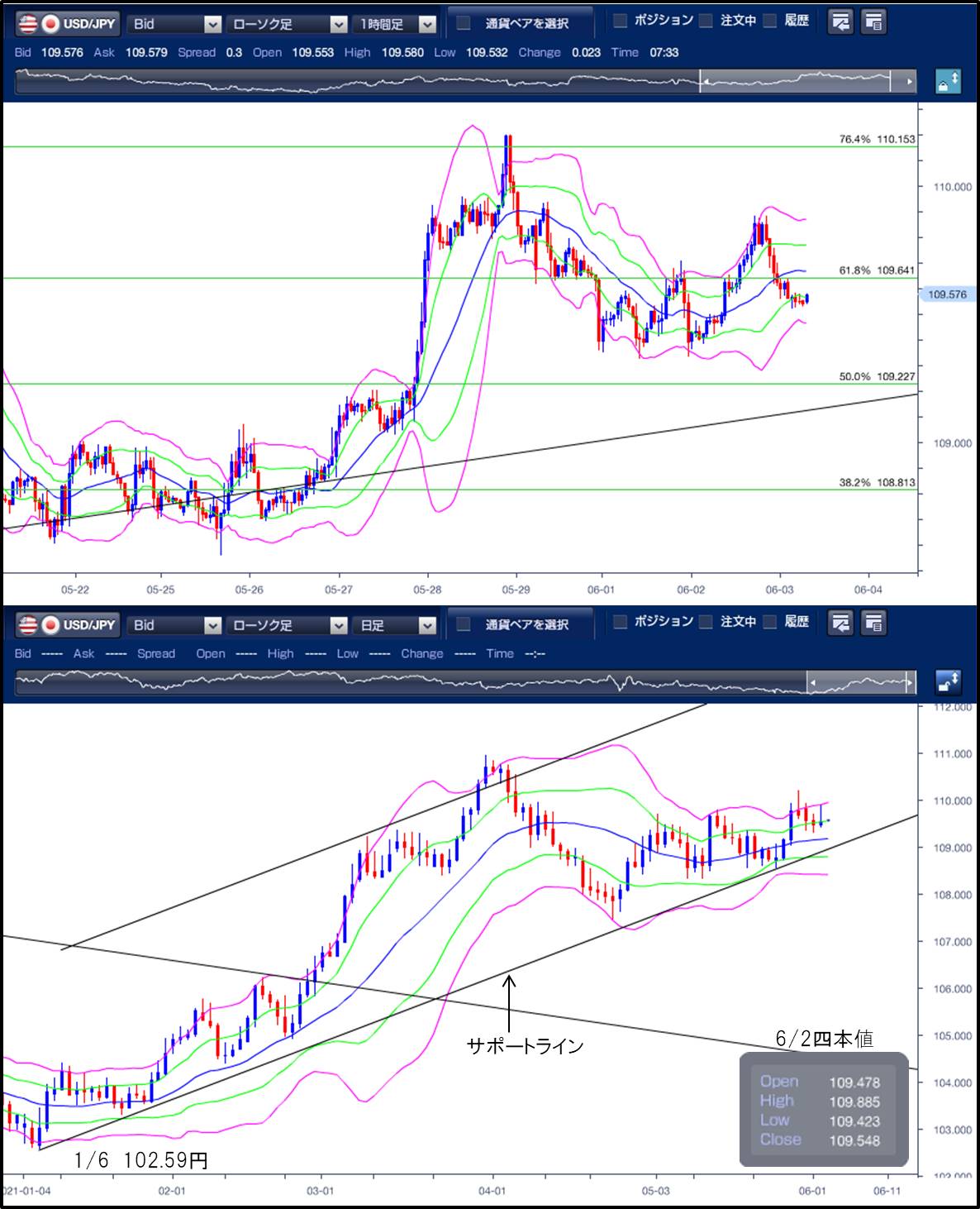 ◆反発。109円台半ばでこう着状態 ================ 昨日(6月2日)のドル円は横這い。一時109.88円まで上昇したものの、109円台後半では戻り売り意欲が強く、109.52円まで反落しました。 東京市場はじり高。下落して始まった日経平均株価が上昇に転じたことを受けてドル買い優勢となり、109.72円まで上昇しました。 海外市場は上昇後に反落。欧州勢が参入後もドル買いの流れは継続し、日通し高値となる109.88円まで上昇しました。 しかし、109円台後半ではドルの戻り売り意欲が強く、109.52円まで反落しました。その後は動意に乏しく、109.54円でNYをクローズしました。 テクニカル(ドル円1時間足チャート)でみると、ボリンジャーバンドの中心線は横這いとなっており、もみ合いを示唆しています。一方、日足チャートの中心線は緩やかな右肩上がりとなっており、上昇を示唆しているため、押し目買い優勢と考えます。 本日は明日(6/4)発表される米雇用統計を控えて、様子見ムードが強まると考えます。 上値目途は、5/31、6/2の高値の109.90円近辺、上抜けると3/31高値(110.96円)から4/23安値(107.47円)のフィボナッチ76.4%戻しとなる110.15円近辺が次のターゲットになります。 下値目途は、50.0%戻しとなる109.22円近辺、下抜けると38.2%戻しとなる108.81円近辺が次のターゲットになります。 ※チャートは、ドル/円の一時間足日足ボリンジャーバンドフィボナッチを表示しています。