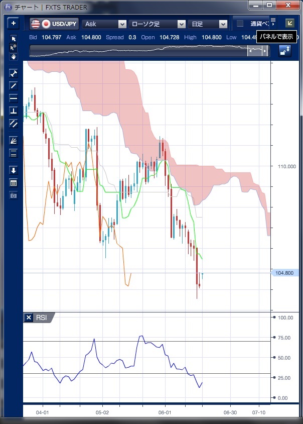 先週のドル/円相場は、週初からドルの上値の重い展開が続きました。 週後半には、日銀金融政策決定会合での現状維持を受けてドルは急落し一時103円58銭と2014年8月以来の安値をつけました。 その後、104円台は回復したものの上値の重い状況が続いています。 23日に英国のEU(欧州連合)からの離脱(BREXIT)是非を問う国民投票を控えリスクを取りにくくなっていることが円買いに繋がり、基本的には投票まで様子見ムードのなか円が底堅い動きを続けそうです。 一目均衡表を見ると、ドル売り・円買いの環境は続いており、簡単には反転する兆しは見えません。 ただし、本日は朝方上方に窓を開けて104円後半でのスタートとなっています。 これは、英世論調査で欧州連合(EU)残留派の勢いに回復傾向が見られ、ポンド/円が急伸したことが背景にあると指摘されます。 このように、英国国民投票への材料しだいでは上下に大きく降らされて、相場が荒れる可能性があります。 英国の国民投票は日本時間24日午後に大勢が判明すると見られており、それまでは慎重に相場を見極める必要がありそうです。 ※チャートは、ドル/円の日足一目均衡表RSIを表示しています。