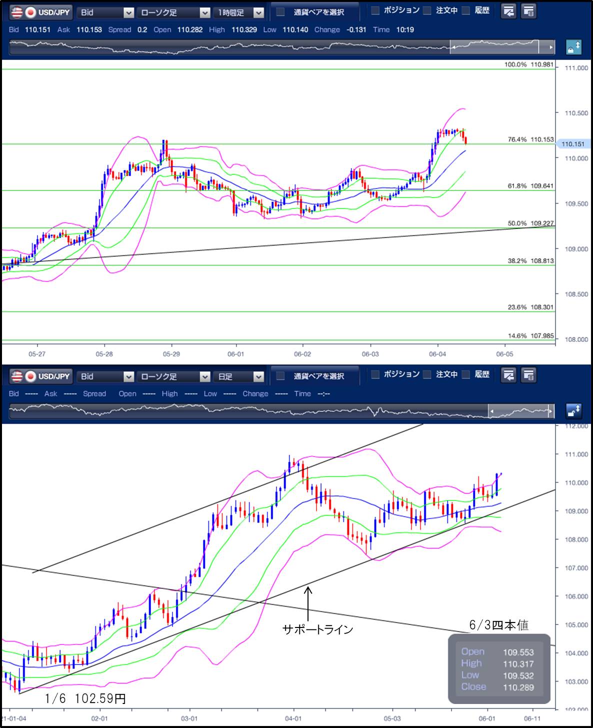 ◆急騰。好調な経済指標の発表を受け、約2カ月ぶりに110.31円を記録 ================ 昨日(6月3日)のドル円は急騰し、一時110.31円と4/6以来となる約2カ月ぶりの高値を記録しました。 東京市場はじり高。下落して始まった日経平均株価が上昇に転じたことを受けてドル買い優勢となり、109.77円まで上昇しました。 海外市場は急騰。欧州勢が参入後は動意に乏しく、109.62〜109.84円の値幅で推移していましたが、NY勢参入後に発表された主要な米経済指標(ADP雇用統計、新規失業保険申請件数、ISM非製造業景況指数)が軒並み予想より強い結果となり、ストップを巻き込みながら上昇し、一時110.31円と4/6以来となる約2カ月ぶりの高値を記録しました。 引けにかけても高値圏で推移し、110.28円でNYをクローズしました。 テクニカル(ドル円1時間足チャート)でみると、ボリンジャーバンドの中心線は右肩上がりで上昇を示唆しています。また、日足チャートの中心線も緩やかな右肩上がりとなっており、エクスパンションとなっていることから、上昇を示唆しています。 本日は、21時半に発表される米雇用統計に注目です。 上値目途は、4/6高値の110.55円近辺、上抜けると3/31高値110.96円が次のターゲットになります。 下値目途は、5/31、6/2の高値の109.90円近辺、下抜けると3/31高値(110.96円)から4/23安値(107.47円)のフィボナッチ61.8戻しとなる109.64円近辺が次のターゲットになります。 ※チャートは、ドル/円の一時間足日足ボリンジャーバンドフィボナッチを表示しています。