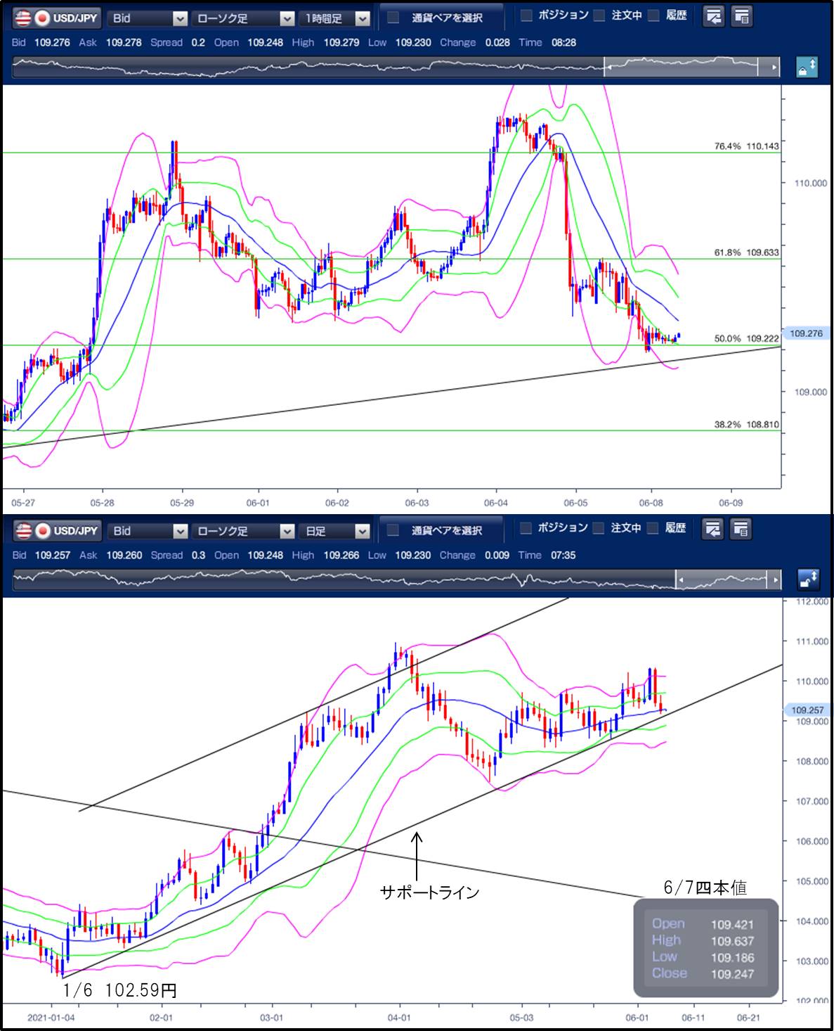 ◆続落。上値と下値の目安が的中 ================ 昨日(6月7日)のドル円は続落し、109.18〜109.63円の値幅で推移しました。 東京市場はもみ合い。109.50円を挟んで狭いレンジで推移しました。 海外市場は軟調。前週末に発表された5月米雇用統計が予想値を下回ったことを受け、米連邦準備理事会(FRB)によるテーパリング観測(量的緩和の縮小)が後退したことから米長期金利が低下し、ドル売り優勢となり109.18円まで下落しました。 ただし、昨日のレポートで記載した109.20円近辺ではドル買い戻しが入って下げ止まり、109.20〜109.30円でこう着状態となりました。NYクローズは109.24円になりました。 テクニカル(ドル円1時間足チャート)でみると、ボリンジャーバンドの中心線は右肩下がりで下落を示唆しています。一方、日足チャートの中心線は緩やかな右肩上がりとなっているため、押し目買い優勢が継続と考えます。 本日の上値目途は、6/7高値、3/31高値(110.96円)から4/23安値(107.47円)のフィボナッチ61.8%戻しとなる109.63円近辺、上抜けると76.4%戻しとなる110.14円近辺が次のターゲットになります。 下値目途は、5/31、6/1、6/4、6/7安値および50.0%戻しとなる109.20〜30円近辺、下抜けると38.2%戻しとなる108.81円近辺が次のターゲットになります。 また、109.10円近辺は1/6を起点としたサポートライン上となり、下抜けた場合には急落する可能性もあるので下抜けるか否かに注目です。 ※チャートは、ドル/円の一時間足日足ボリンジャーバンドフィボナッチを表示しています。