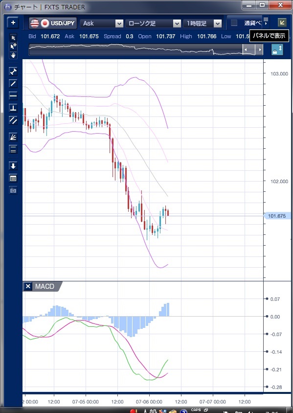 昨日のドル/円相場は、102円半ばでスタートしたものの、その後は徐々にドルが軟化する展開となりました。 東京朝方にMACDが買い転換仕掛けたものの失敗しており、その後のドルの下落を示唆する形となっていたことが確認できます。 また、東京午前中には、相場はボリンジャーバンドを下抜けバンドウォークを時限しながら下落を続けており、海外時間では6月28日以来の安値101円45銭をつけました。 海外時間のドル売りは、米国の5月製造業受注が予想を下回ったこと、英中銀のカーニー総裁がEU離脱決定による経済の成長鈍化を警告したこと、などを嫌ったリスク回避の動きが背景との指摘もあります。 NYの引けにかけては、MACDも買い転換しており、目先下げと待った動きとなっています。 英保守党・党首選でリードを保つメイ内相が首相に就任した場合にはEU離脱手続きに踏み切る意向を示していることで、EU離脱に伴う英景気の悪化が再び材料視されているとの見方もあり、市場のリスク回避姿勢は継続し、ドル/円は既に102円台が重くなってきているように見えます。 ※チャートは、ドル/円の1時間足ボリンジャーバンドMACDを表示しています。