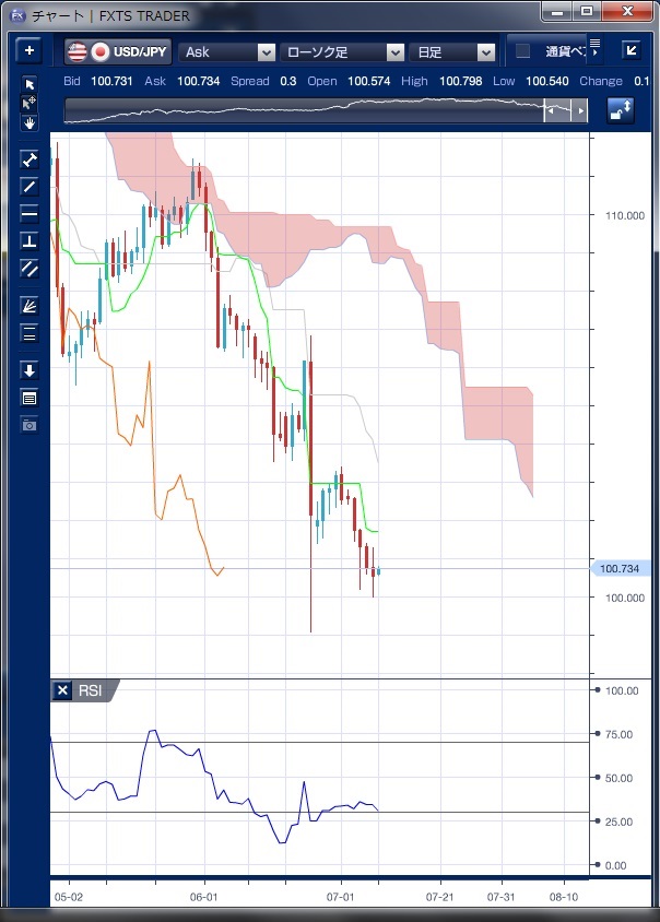先週のドル/円相場は、一貫してドルが軟化する動きとなりました。 前週末の7月1日が前日の陽線を包んだ陰線となっており、ドルの下落を示唆していましたが、そのとおりの流れとなってしまいました。 目新しい材料がなく、週末の米雇用統計を控えて模様眺めが続くなか、英国のEU離脱決定の後遺症がマーケットの不安材料としてドルの上値を抑える形となっていました。 週末の米雇用統計では、非農業部門雇用者数が28.7万人増と市場予想を大きく上回り、昨年10月以来の高い伸びとなり、これを受けて101円24銭まで上昇しました。 しかし、前月分が3.8万人増から1.1万人増に下方修正されたことや、失業率は4.9%と市場予想を上回ったことなどから米国の利上げは遠のいたとの見方も出てドルは反落し、100円を割り込む動きとなりました。 その後は、100円台後半へ値を戻して引けていますが、非農業部門雇用者数の大幅増加を受けても上値が限られたものであったことから、ドルの下方バイアスが強まったようにも思えます。 今週も、100円割れをうかがう動きが出てきそうですが、100円割れが定着してしまうと、じりじりと95円まで下落が続く可能性もあり、100円の攻防が注目されるでしょう。 ※チャートは、ドル/円の日足一目均衡表RSIを表示しています。