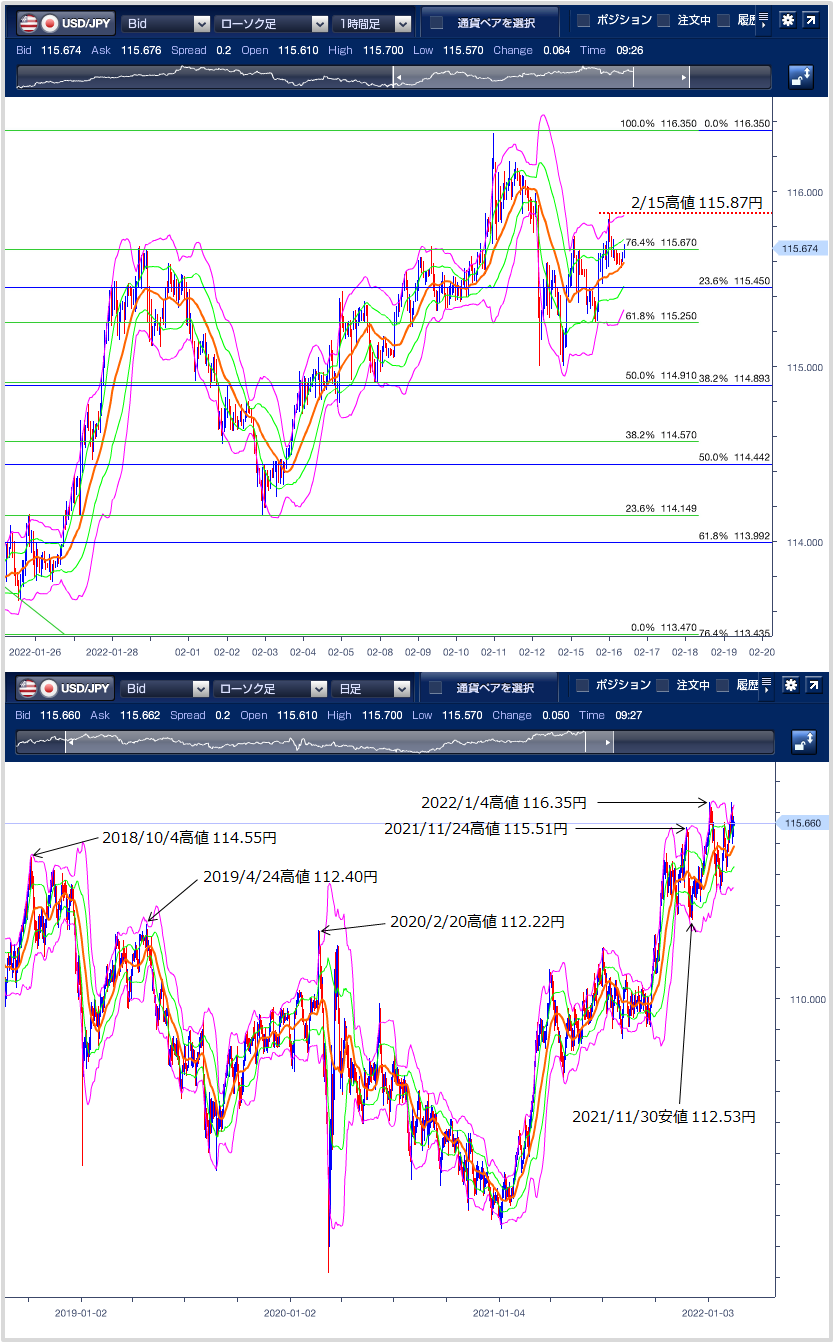 1時間足のボリンジャーバンドは、中心線が右肩上がりで上昇を示唆しているものの、-2σが収斂しており、上昇に一服感がでております。日足ボリンジャーバンドは中心線が上向きで上昇を示唆しています。 以上のことから、本日は、もみ合い(115.25円〜116.00円)になると予想します。 上値目途は、2/15高値115.87円近辺となります。節目として意識される116円を上抜けると、1/4高値116.35円が視野に入ります。下値目途は、2021/11/30安値112.53円から1/4高値116.35円のフィボナッチ23.6% 押しとなる115.45円近辺となり、下抜けると、2/15安値の115.25円が次のターゲットとなります。 ※チャートは、ドル/円の一時間足日足ボリンジャーバンドフィボナッチを表示しています。