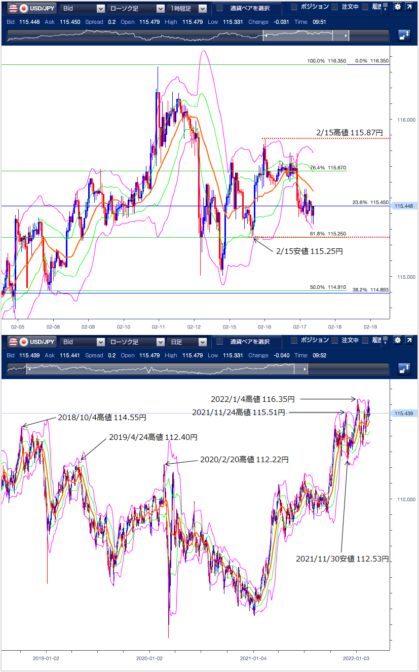 昨日(2月16日)のドル円は、ウクライナ情勢をめぐって、115.35円〜115.78円と43銭幅で方向感に欠けた値動きとなりました。