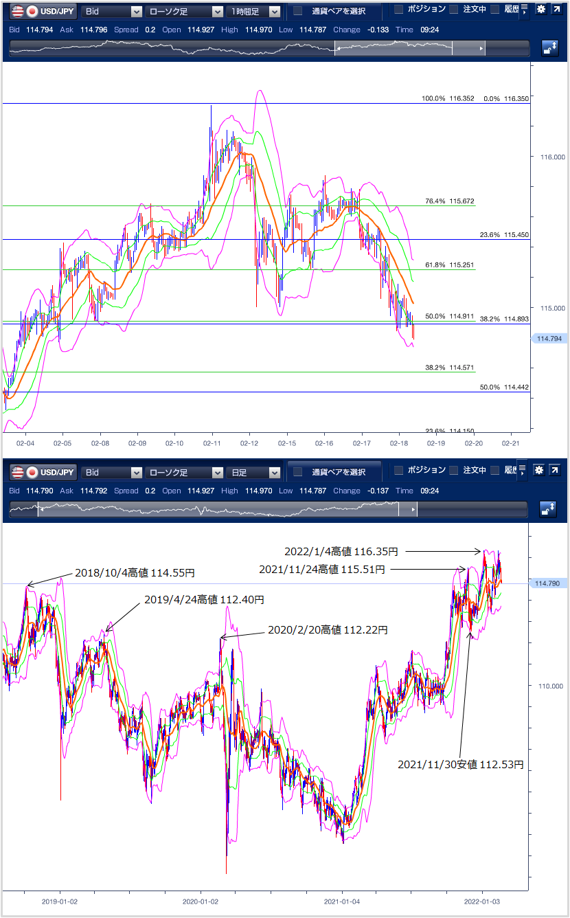 1時間足のボリンジャーバンドは、中心線が右肩下がりとなっており、下落を示唆しています。日足ボリンジャーバンドは中心線が上向きですが±2σが収斂しはじめており、上昇に一服感がでています。 以上のことから、本日は、もみ合い(114.44円〜115.25円)になると予想します。 上値目処は、節目となる115.00円となり、上抜けると、1/4高値116.35円から1/24安値の113.47円の61.8%戻しとなる115.25円近辺が次のターゲットとなります。下値目途は、2021/11/30安値112.53円から1/4高値116.35円のフィボナッチ50.0%押しとなる114.44円近辺となります。 ※チャートは、ドル/円の一時間足日足ボリンジャーバンドフィボナッチを表示しています。