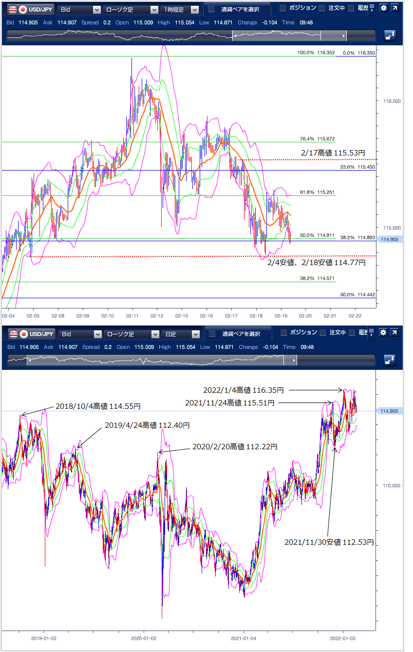 1時間足のボリンジャーバンドは、中心線が右肩下がりとなっており、下落を示唆しています。日足ボリンジャーバンドは中心線が上向きですが±2σが収斂しはじめており、上昇に一服感がでています。 以上のことから、本日は、もみ合い(114.44円〜115.25円)になると予想します。 上値目処は、1/4高値116.35円から1/24安値の113.47円の61.8%戻しとなる115.25円近辺となり、上抜けると、2/17高値115.53円近辺が次のターゲットとなります。下値目途は、2/4安値、2/18安値の114.77円近辺となり、下抜けると、2021/11/30安値112.53円から1/4高値116.35円のフィボナッチ50.0%押しとなる114.44円近辺となります。 ※チャートは、ドル/円の一時間足日足ボリンジャーバンドフィボナッチを表示しています。