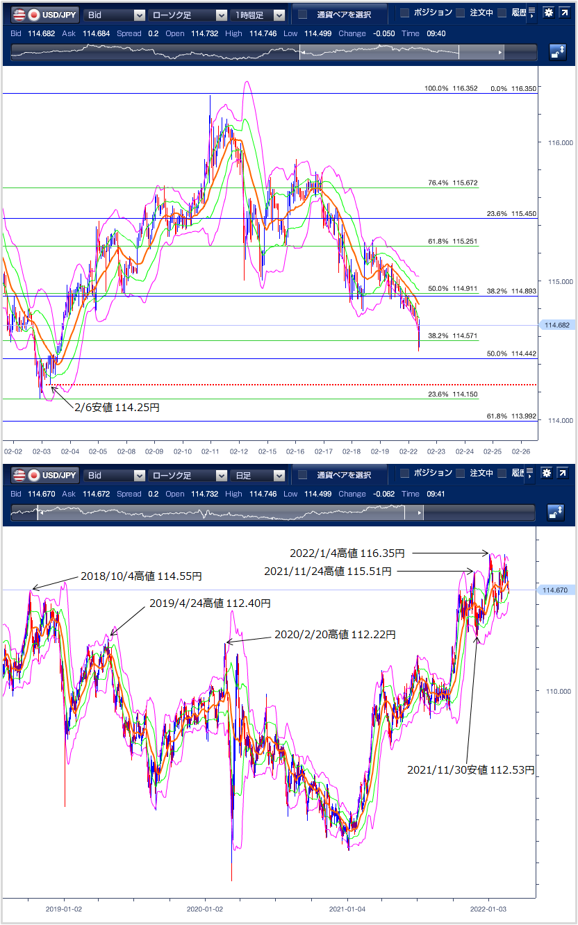 1時間足のボリンジャーバンドは、中心線が右肩下がりとなっており、下落を示唆しています。日足ボリンジャーバンドは中心線が上向きですが、±2σが収斂しはじめています。また、ローソク足が中心線の下に位置する形状から、上昇に一服感がでています。 以上のことから、本日は、もみ合い(114.25円〜114.91円)になると予想します。 上値目処は、1/4高値116.35円から1/24安値の113.47円の50.0%戻しとなる114.91円近辺となり、上抜けると、61.8%戻しとなる115.25円近辺が次のターゲットとなります。下値目途は、2021/11/30安値112.53円から1/4高値116.35円のフィボナッチ50.0%押しとなる114.44円近辺となり、下抜けると、2/6安値114.25円近辺が次のターゲットとなります。 ※チャートは、ドル/円の一時間足日足ボリンジャーバンドフィボナッチを表示しています。