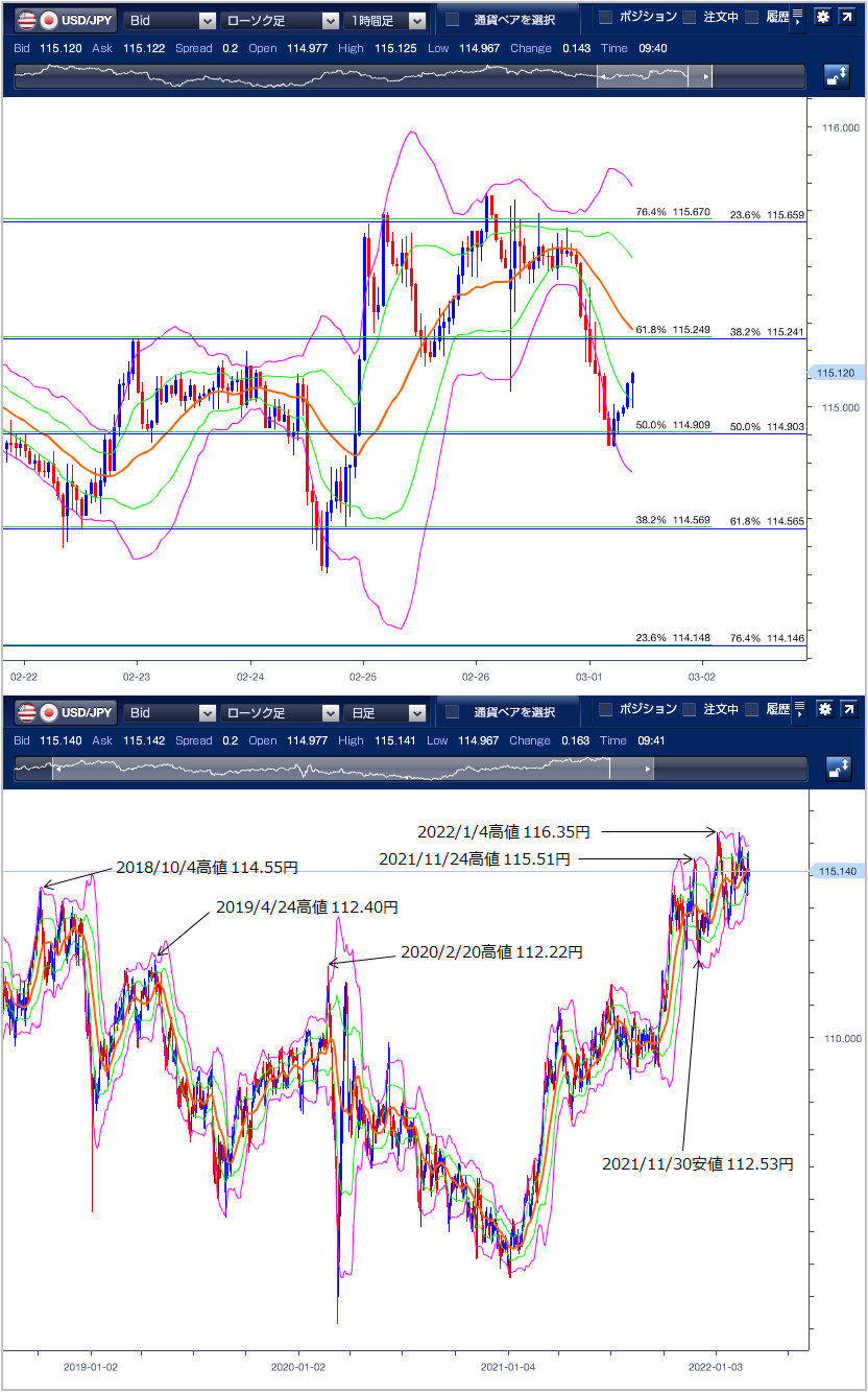 昨日(2月28日)のドル円は、ウクライナ情勢を背景に不安定な値動きが続くなか、114.86円まで下落しました。 東京市場は、欧米諸国が週末2/26にロシア大手銀行を国際決済網の国際銀行間通信協会(SWIFT)から締め出す金融制裁措置を打ち出したことを受け、リスク回避の円買いドル売りが先行し、早朝に115.05円まで急落する場面もありましたが、ロシア大統領府のペスコフ報道官が、ウクライナとの停戦交渉のためベラルーシに代表団を送り込んだことが明らかにされるとリスク回避姿勢が後退し、115.74円まで買い戻されるなど荒い値動きとなりました。 海外市場は、下落。ウクライナとロシアの代表団との停戦を巡る協議では、両国の立場が大きく異なり、今後の対話で進展が望めるかは不透明な要素が多く、その結果を受けてダウ平均が580ドル超下落するなど、リスク回避の円買いドル売りが優勢となり、日通し安値となる114.86円まで下落しました。引けにかけて小反発するも、戻りは鈍く114.97円でNYをクローズしています。
