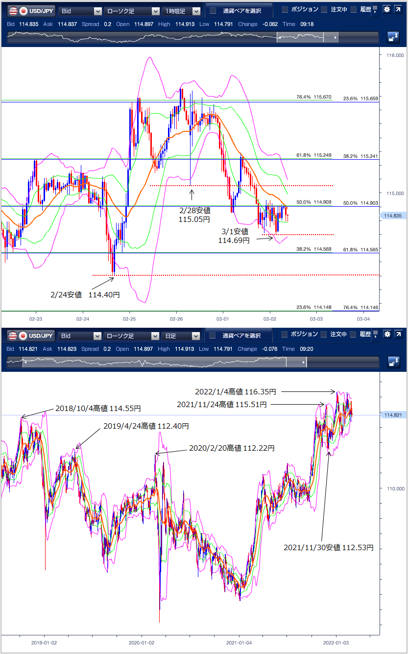 昨日(3月1日)のドル円は、ウクライナ情勢を背景としたリスク回避の円買いと対ユーロに対する有事のドル買いの双方により、方向感に欠けた展開となりました。 東京市場は、上値が重い。日経平均株価が上昇して始まったことを背景に円売りが先行し、115.28円まで値を上げましたが、その後、株価が伸び悩むと次第に上値が重くなり、115.01円まで下落する展開となりました。欧州市場は、ロシア軍によるウクライナ侵攻の激化を伝える報道から、リスク回避の円買いドル売りが優勢となり、114.71円まで下落しました。NY勢参入後は、対ユーロを中心にドル買いが進んだ影響から下げ渋り、114.69円〜114.95円と26銭幅でもみ合いとなり、114.89円でNYをクローズしています。