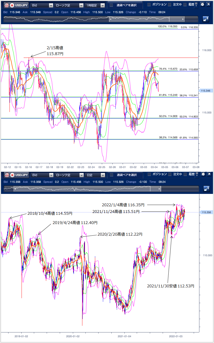 1時間足のボリンジャーバンドは、エクスパンションを形成しながら中心線が下向きで強い下落を示唆しています。日足ボリンジャーバンドは中心線が穏やかな上向きにですが、±2σが収斂し始めており、上昇に一服感がでています。 以上のことから、本日は、ドル売り優勢(114.90円〜115.67円)になると予想します。 上値目処は、3/2高値かつ1/4高値116.35円から1/24安値の113.47円の76.4%戻しとなる115.67円近辺となり、上抜けると、2/15高値115.87円近辺が次のターゲットとなります。 下値目途は、1/24安値113.47円から2/10高値116.33円の38.2%押しにあたる115.24円近辺となり、節目となる115円を下抜けると、50.0%押しとなる114.90円が次のターゲットとなります。
