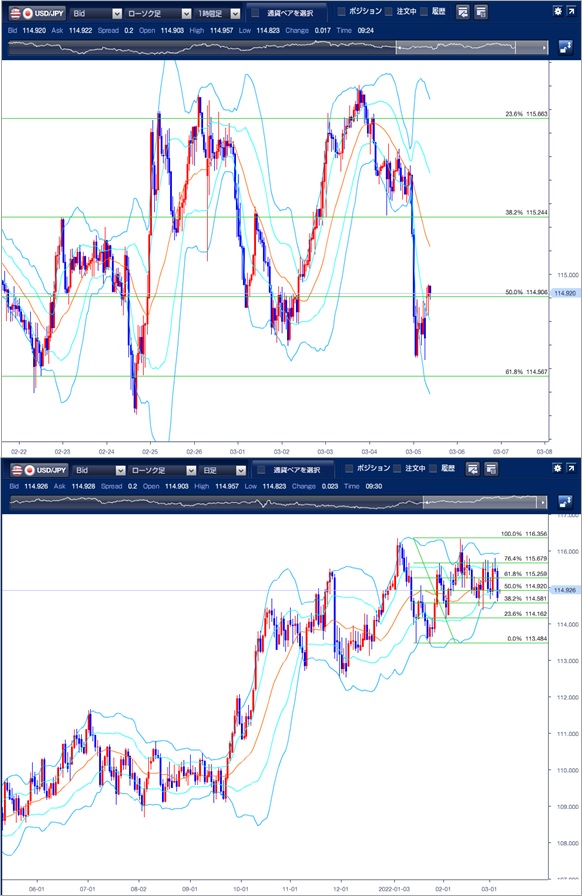 先週末(3月4日)のドル円は下落。2月雇用統計の結果が良好となったものの、引き続きウクライナ情勢を背景としたリスク回避の動きが鮮明となり、114.65円まで下落しました。 東京市場のドル円は売りが先行。ロシア軍が欧州最大規模の原子力発電所であるウクライナのザポリージャ原発に砲撃を開始、火災が発生しているとの報道が伝わったことで、リスク回避の動きが強まり、一時115.25円まで下押ししました。 海外市場は下落。注目された米2月雇用統計は、非農業部門雇用者数変化が 67.8万人(予想 40.0万人)となったことでドル買いで反応したものの、動きは限定的となりました。 指標発表後も引き続きウクライナ情勢の緊迫化により、米国株が大幅に下落したことや、米10年債利回りが一時1.69%台まで低下したことで、日通し安値となる114.65円まで下落。その後も戻りは鈍く、114.73円でNYをクローズしています。
