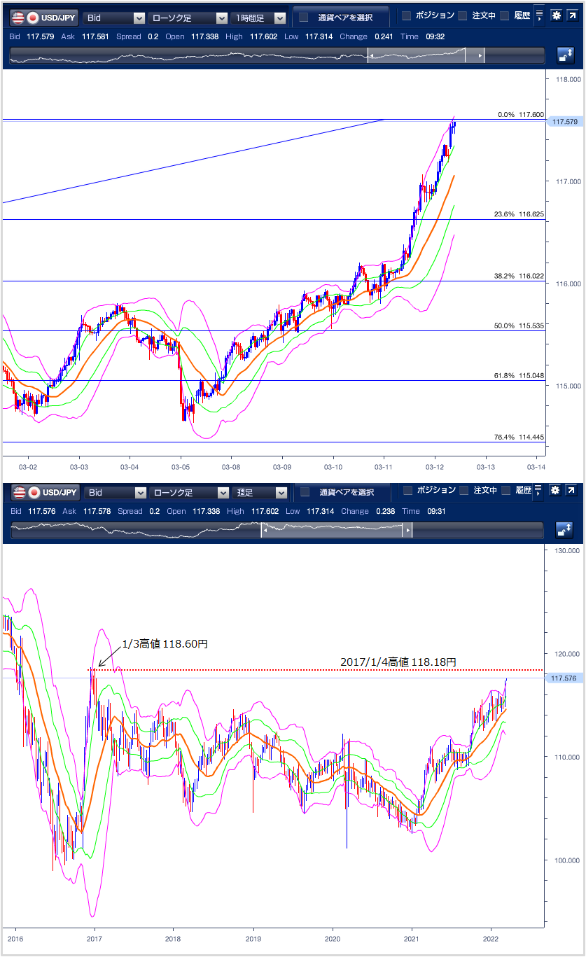 先週末(3月11日)のドル円は、15?16日の米連邦公開市場委員会(FOMC)を前に、日米金利差が意識された円売りドル買いが優勢となり、2017年1月以来、約5年2カ月ぶりの高値117.35円まで急伸しました。 東京市場のドル円は、本邦輸入企業による円売りドル買いから、116.09円〜116.74円と65銭幅で堅調に推移しました。海外市場は続伸。利上げスタンスの米国と緩和的な金融政策スタンス維持の日本による日米金利差を意識した円売りドル買いが先行し、ロシア・ウクライナを巡る地政学的リスクの高まりからなる「有事のドル買い」もあり、2017年1月以来約5年2カ月ぶりの高値となる117.35円まで上昇しました。引けにかけて小反落するも下値は堅く117.24円でNYをクローズしています。