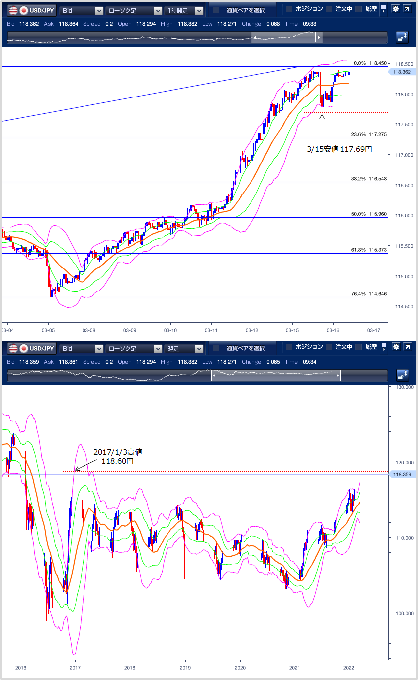 昨日(3月15日)のドル円は、7日続伸。株価の下落を背景に急落したものの、日米金利差が意識された円売りドル買が優勢となり、底堅い値動きとなりました。 東京市場のドル円は、118.11円〜118.45円と34銭幅で底堅く推移しました。 海外市場は、欧州勢参入後、欧州株価や時間外のダウ先物の下落などを受けて、円買いドル売りが優勢となり、10年債利回りの低下につれ、円買いドル売りが加速し、日通し安値となる117.69円まで急落しました。ただ、翌日に控えた米連邦公開市場委員会(FOMC)では、0.25%の利上げが確実視されており、高水準のインフレが続く状況から、今後の利上げペースが加速されるのではという期待感から円売りドル買いが優勢となり、118.39円まで上昇する展開となりました。引けにかけても底堅く推移し、118.29円でNYをクローズしています。 なお、本日は、27時00分から米連邦公開市場委員会(FOMC)が開かれ、終了後政策金利の発表があります。 また、その後、27時30分からは、パウエル米連邦準備理事会(FRB)議長による定例記者会見も予定されていますので発言内容には注目です。