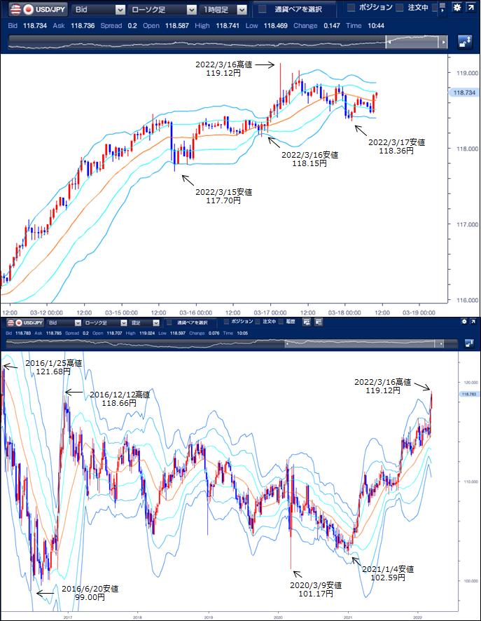 1時間足のボリンジャーバンドは、横ばいとなっており、保ち合いを示しています。 日足のボリンジャーバンド中心線は上向きでエクスパンションを形成しているため強い上昇を示していますが、-2σが収斂し始めており、上昇がいったん収まる可能性があります。 以上のことから、本日は、保ち合い(118.36円〜119.00円)になると予想します。 上値目途は、昨日高値の119.02円となり、上抜けると3/16高値の119.12円となります。下値目途は、3/17安値118.36円となり、下抜けると3/16安値の118.15円が次のターゲットとなります。 ※チャートは、ドル/円の一時間足日足ボリンジャーバンドフィボナッチを表示しています。