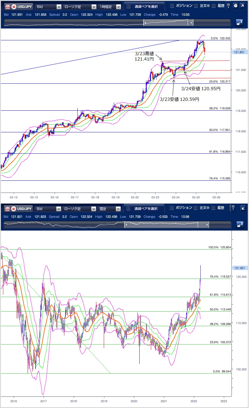 1時間足のボリンジャーバンドは、中心線は上昇しているものの、±2σが収斂しており、もみ合いを示唆しています。一方、日足・週足のボリンジャーバンドは、中心線はいずれも右肩上がりとなっており、エクスパンションを形成し、バンドウォークが確認できます。 以上のことから、本日は、もみ合い(120.95円〜122.40円)になると予想します。 上値目途は、3/24高値122.40円近辺となり、明確に上抜けると、心理的節目となる123.00円が次のターゲットとなります。下値目途は、3/23高値の121.41円(3/4安値114.63円から3/24高値122.45円の14.6%押し)、下抜けると3/24安値120.95円となります。 ※チャートは、ドル/円の一時間足週足ボリンジャーバンドフィボナッチを表示しています。