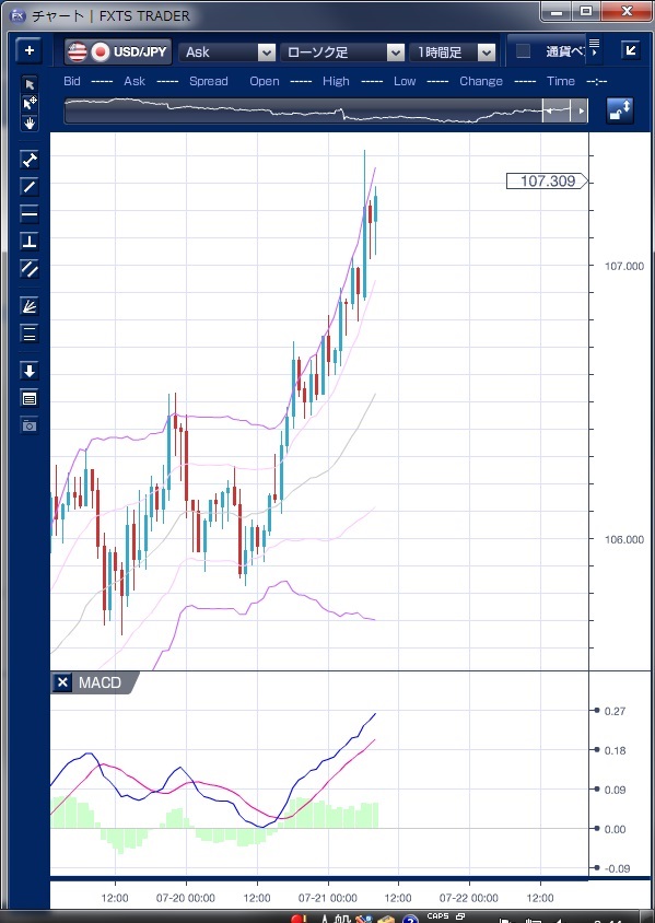 昨日のドル/円相場は、106円台でスタートしたものの、日経平均株価の下落につられる形でドルが軟化し、一時105円83銭をつけました。 その後、日経平均が下げ幅を縮めると、ドルも反発し106円台を回復する動きとなりました。 欧州時間に入っても、ドルは底堅く推移し106円台後半へと上昇しました。 MACDを見ると、欧州参入前に既に買い転換していることが確認でき、このドル上昇を示唆する形となっていることがわかります。 NY時間に入ると、一部メディアが「安倍政権が新たにまとめる経済対策の事業規模を20兆円超と、当初の見込みとされていた10兆円超を倍増させる」と報じたことで、6月10日以来の107円台を回復しました。 このドル上昇では、ボリンジャーバンドの上抜けとバンドウォークが観察されましたが、ロアーバンドの下落は小さかったことから、強いトレンドを感じさせるものとはなりませんでした。 来週のFOMCや日銀金融政策決定会合に対する期待感から、リスク選好の流れは続くものとみられ、日経平均株価の上昇とともに、107円台が定着できるかが注目されます。 ※チャートは、ドル/円の1時間足ボリンジャーバンドMACDを表示しています。