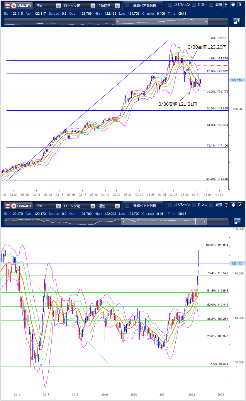 1時間足のボリンジャーバンドは、中心線は横ばいに転じており、もみ合いを示唆しています。日足・週足のボリンジャーバンドは、中心線はいずれも右肩上がりとなっており、上昇を示唆しています。ただし、日足のボリンジャーバンドでは-2σが収斂しており、上昇にも一服感が出始めています。 以上のことから、本日は、もみ合い(121.31円〜123.20円)になると予想します。 上値目途は、3/30高値123.20円、上抜けると3/29高値124.30円が次のターゲットとなります。 下値目途は、3/30安値121.31円近辺となり、下抜けると、2022/3/4安値114.63円から同年3/28高値125.10円の38.2%押しとなる121.10円近辺が次のターゲットとなります。 ※チャートは、ドル/円の一時間足週足ボリンジャーバンドフィボナッチを表示しています。