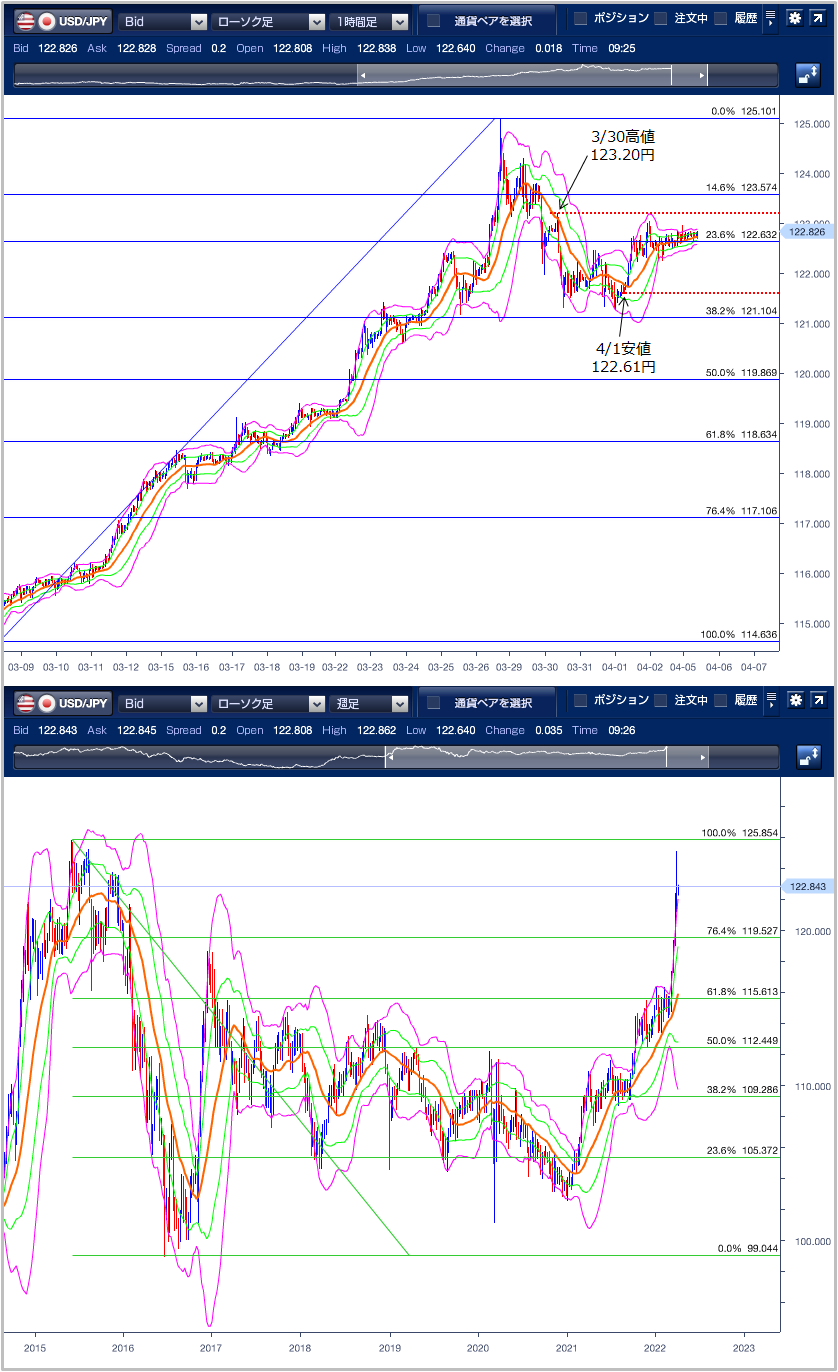 1時間足のボリンジャーバンドは、中心線は緩やかな上昇となっていますが、バンド幅が縮小しており、持ち合いを示唆しています。一方、日足・週足のボリンジャーバンドは、中心線はいずれも右肩上がりとなっており、上昇を示唆しています。ただし、日足のボリンジャーバンドでは-2σが収斂しており、上昇にも一服感が出始めています。 以上のことから、本日は、もみ合い(122.00円〜123.20円)になると予想します。 上値目途は、4/1高値123.03円近辺となり、上抜けると、3/30高値123.20円近辺が次のターゲットとなります。下値目途は、節目122.00円となり、下抜けると、4/1安値121.61円近辺が次のターゲットとなります。 ※チャートは、ドル/円の一時間足週足ボリンジャーバンドフィボナッチを表示しています。