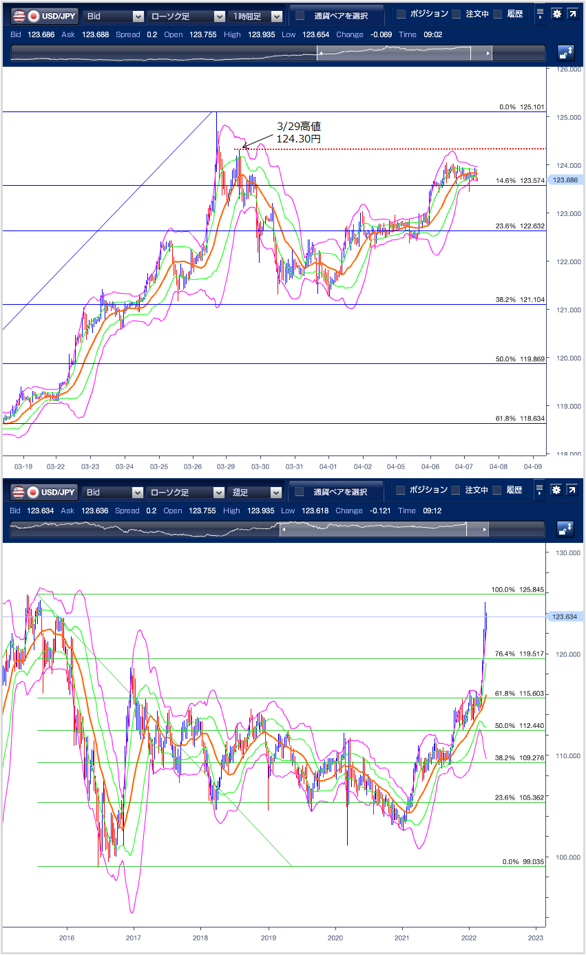 1時間足のボリンジャーバンドは、中心線は穏やかな下向きに転じており、下落を示唆しています。一方、日足・週足のボリンジャーバンドは、中心線はいずれも右肩上がりとなっており、上昇を示唆しています。ただし、日足のボリンジャーバンドでは-2σが収斂しており、上昇に一服感が出ております。 以上のことから、本日は、もみ合い(123.00円〜124.30円)になると予想します。 上値目途は、節目の124.00円となり、上抜けると、3/29高値124.30円近辺が次のターゲットとなります。下値目途は、節目123.00円となり、下抜けると、3/4安値114.63円から3/28高値125.10円の23.6%押しにあたる122.63円近辺が次のターゲットとなります。 ※チャートは、ドル/円の一時間足週足ボリンジャーバンドフィボナッチを表示しています。