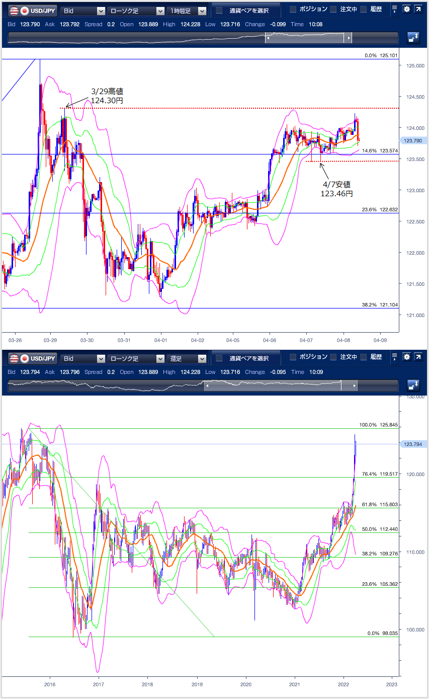 昨日(4月7日)のドル円は、米10年債利回りの上昇や好調な雇用関連指標の結果を受け、124.00円まで上昇しました。 東京市場のドル円は、123.46円〜123.93円と47銭幅で方向感に欠けた値動きとなりました。 海外市場は、上昇。米10年債利回りが、2019年3月以来約3年1カ月ぶりの高水準となる2.67%台まで上昇すると、リスク選好の円売りドル買いが優勢となり、その後発表された前週分の米新規失業保険申請件数(予想: 20.0万件 結果: 16.6万件)と1968年11月以来約53年半ぶりの低水準を記録したことで円売りドル買いが加速し、日通し高値となる124.00円まで上昇しました。ただし、前日高値124.05円が意識され、利食い売りに押される展開となりましたが、下値も堅く、123.89円でNYをクローズしています。