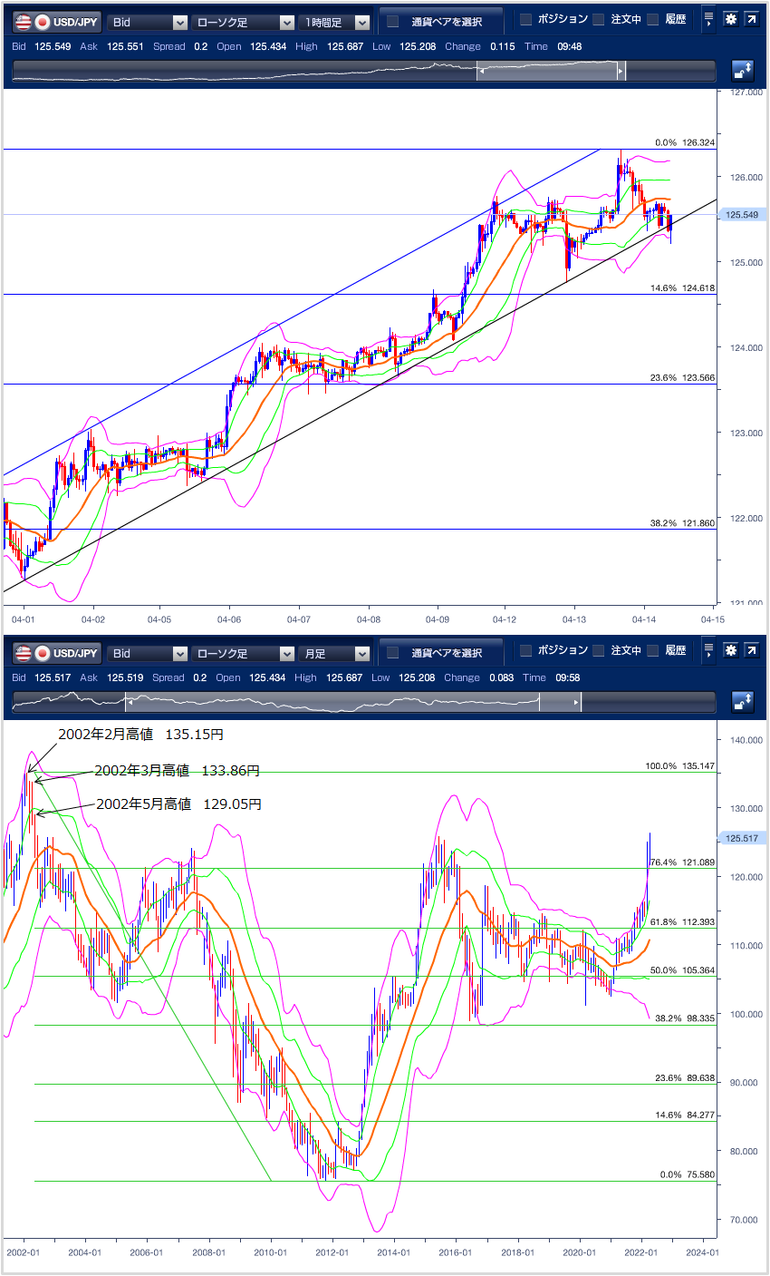 昨日(4月13日)のドル円は、黒田日銀総裁の「強力な金融緩和継続」発言から円売りが先行し、2002年5月以来およそ20年ぶりの高値126.32円まで急騰しました。 東京市場のドル円は上昇。日経平均株価が堅調に推移したことを受け、円売りドル買いが優勢となり、125.73円まで上昇しました。 海外市場は、大幅続伸。欧州勢参入後の15過ぎに、黒田日銀総裁が第97回信託大会でのあいさつで「現在の強力な金融緩和を粘り強く続ける」との発言から緩和政策を継続する姿勢を改めて強調したことで、円安容認と捉えた円売りが先行し、ストップを巻き込みながら、2002年5月17日以来、約20年ぶりの高値となる126.32円まで急伸しました。ただし、急激な上昇に高値を警戒する向きもあり、利食い売りに押され、125.37円まで下落する展開となりました。