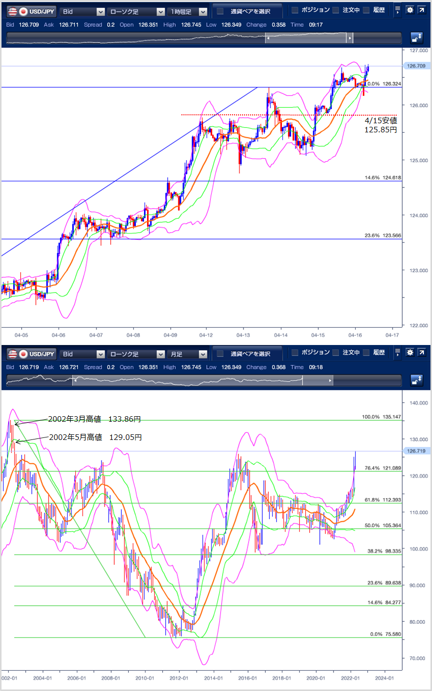 先週末(4月15日)のドル円は、東京市場で付けた126.68円を高値に世界各国が祝日で休場となる中、方向感に欠けた展開となりました。 東京市場のドル円は上昇。前日NY市場でのドル買いの流れを引き継ぎ堅調に推移し、15時台に2002年5月以来の高値となる126.68円まで上昇しました。 海外市場は、聖金曜日の祝日(グッドフライデー)で世界各国が休場となり、市場参加者が激減する中、126.30円〜126.68円と38銭幅で方向感に欠けた値動きが続きました。引けにかけて小反落するも下値は堅く、126.17円でクローズしています。