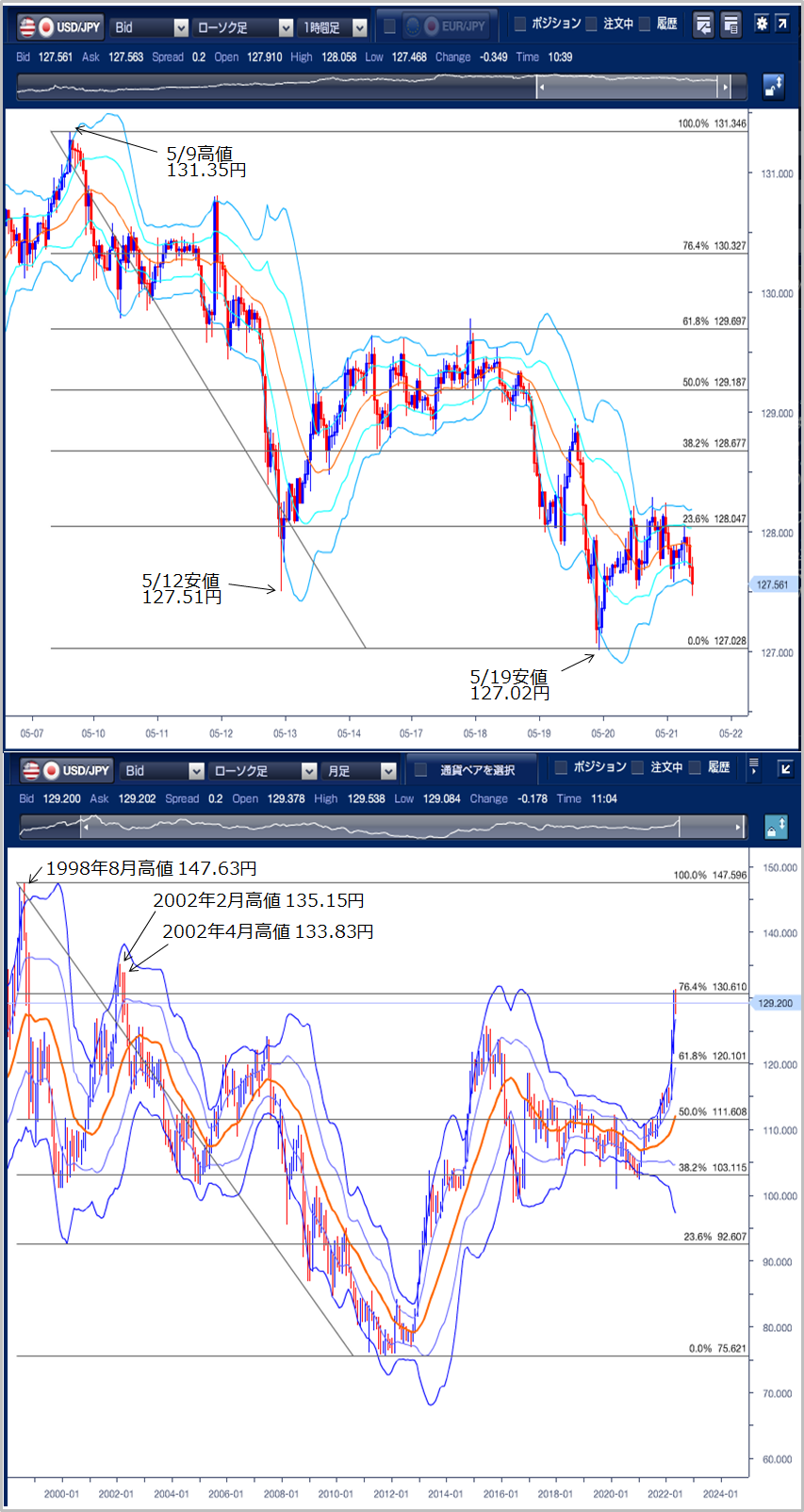 1時間足のボリンジャーバンドは、中心線が横ばいとなっており、もみ合いを示唆しています。また、日足のボリンジャーバンドは上向きから横ばいに転じており、もみ合いを示唆しています。 なお、週足・月足ともにボリンジャーバンドの中心線はいずれも上向きとなっており、上昇を示唆しています。 以上のことから、本日は、もみ合い(127.02円〜128.30円)になると予想します。 上値の目途は5/20高値の128.30円、上抜けると、5/4安値かつ、5/9高値131.35円から5/19安値127.02円の38.2%戻しにあたる128.65円近辺が次のターゲットとなります。 下値目途は、5/19安値127.02円、下抜けると4/27安値126.93円が次のターゲットとなります。 ※チャートは、ドル/円の一時間足週足ボリンジャーバンドフィボナッチを表示しています。