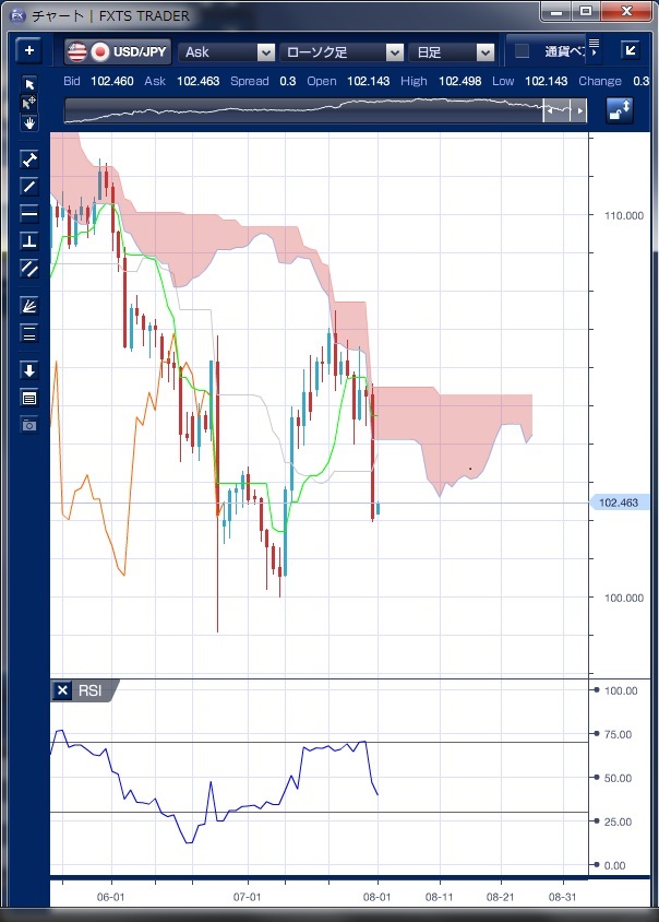 先週のドル/円相場は、日米の金融政策の決定会合に商店が集まり、週前半は模様眺めで方向感の動きが続きました。 26-27日に開かれた米連邦公開市場委員会(FOMC)では金融政策の現状維持が予想通り決まったものの、9月利上げの可能性は残されたことでドルは底堅い動きとなりました。 また、日本政府による事業規模28兆円超の大型経済対策に対する期待感や50年国債発行の思惑などでも、ドル買い・円売り要因との指摘もありました。 しかし、29日に開いた金融政策決定会合で追加緩和を決めたものの、内容がETFの買い入れ増額などにとどまり、円売り材料にはならないとの見方が広がり、ドルは102円台後半まで反落しました。 さらに、海外時間では、4-6月期の米GDP成長は市場予想を大きく下回る前期比年率+1.2%の低い伸びにとどまったことから、9月利上げ観測は後退し、米長期金利は低下したことがリスク回避のドル売りを促し、ドル/円は一時102円を割れる展開となりました。 テクニカルで見ても先行スパンの雲に跳ね返されて反落した形となっており、また遅行スパンとローソク足の関係では、遅行スパンが6月24日の急落の影響を受けた動きでの下押しとなっています。 先週末に急落したドル/円ですが、今週は8月2日に閣議決定される政府の大型経済対策(事業規模は28.1兆円程度)への期待で、国内株が上昇する可能性が高く、ドル買い・円売りをサポートする要因となりそうです。 また、8月5日発表の7月米雇用統計も非農業部門雇用者数が前月比+18万人程度と予想されており、予想通りならば雇用情勢の改善は続いていると判断され、年内利上げ観測からドル買い材料となることが考えられます。 ※チャートは、ドル/円の日足一目均衡表RSIを表示しています。