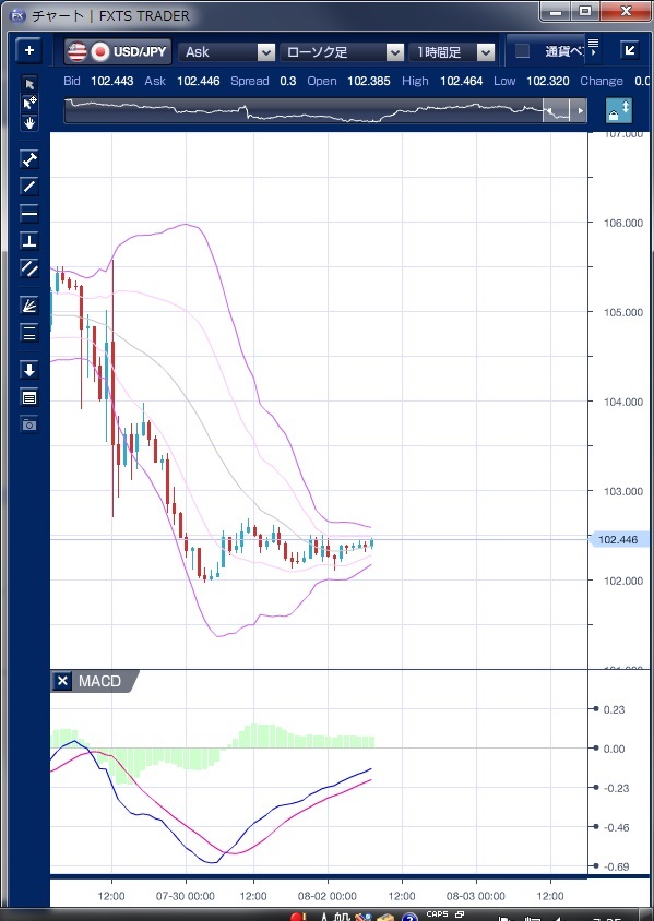 昨日のドル/円相場は、先週に日米の中央銀行イベントを通過し、海外勢の間では夏休みムードも出始めており、102円台での動意の乏しい動きとなりました。 東京時間、朝方の安値102円ちょうど水準から徐々に上値を伸ばし一時102円68銭まで上昇しましたが、その後のフォローはなく102円前半へ押し戻される展開でした。 欧州時間も同様で、102円台前半で方向感のない動きが続きました。 NY時間に入ると、7月の米ISM製造業景況指数が52.6と市場予想や前月を下回ったことを受けて米債利回りが下落に転ずると、ドル円は102円12銭まで下落しましたが、102円割れを試しにいく勢いはありませんでした。 取引は全般に低調で先週の疲れがでているとの指摘も聞かれました。 テクニカルで見ると、ボリンジャーバンドは収縮を続けており、MACDが買いシグナルを出し続けながらも、相場が横這いとなっていることから、現状では先週末のドル急落に対する調整を続けていることが示唆されます。 ※チャートは、ドル/円の1時間足ボリンジャーバンドMACDを表示しています。