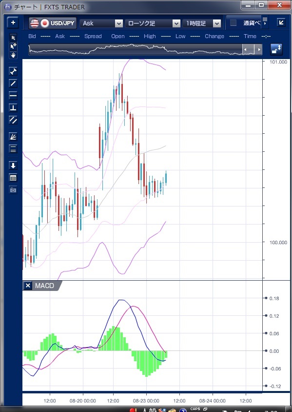 昨日のドル/円相場は、週明けの早朝にまとまったドル買いが持ち込まれ100円台後半まで上昇してスタートしました。 先週末に黒田日銀総裁が新聞のインタビューで「9月に開かれる次の金融政策決定会合で予定される総括的な検証を踏まえ、必要な場合には躊躇なく追加的な緩和措置を講じる可能性は十分ある」と発言したことが材料視されたとの指摘もありました。 その後、100円台前半に押し戻されたものの、フィッシャー米連邦準備理事会(FRB)副議長のタカ派的発言が意識され、欧州スタート前に再び101円を伺う動きとなりました。 この上昇で、ボリンジャーバンドの上抜けとバンドウォークが示現していることが確認できます。 欧州時間に入ると、材料の無いなか、東京時間では小高く推移していた米債利回りが、低下基調での推移となり、ドルも押し戻される動きとなりました。 MACDを見ても、欧州スタート前に既に売り転換しており、ドル下落を示唆していたことがわかります。 NY時間に入っても、米国債利回りの低下や原油先物の反落を意識したドル売りに上値を抑えられ100円台前半での持ち合いとなっています。 今週末のイエレンFRB議長の講演でFRBの姿勢を確認したいとの思惑は強いものの、同議長が今後について明確なコメントを出すとの見方は少なく、市場は手掛かり難のまま100円台での方向感のない推移が予想されています。 ※チャートは、ドル/円の1時間足ボリンジャーバンドMACDを表示しています。