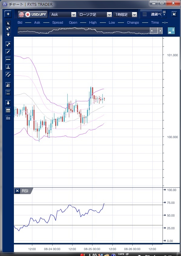 昨日のドル/円相場は、アジア時間から海外時間までを通しても、値幅は約50銭程度の膠着した動きとなりました。 イエレン米連邦準備理事会(FRB)議長講演を前に様子見ムードが広がっており、「完全にイベント待ちのムード」と指摘されます。 昨日は、東京及びNY時間でボリンジャーバンドの上抜けを試す局面がありましたが、ともにバンドの拡大を引き起こすことはなく、一過性の動きにとどまり、相場に方向感がないことが確認されています。 同議長の講演は日本時間の本日午後11時から開始の予定となっており、本日の東京市場でもドル/円は様子見ムード継続のなか、100円台前半での推移となりそうです。 ※チャートは、ドル/円の1時間足ボリンジャーバンドRSIを表示しています。