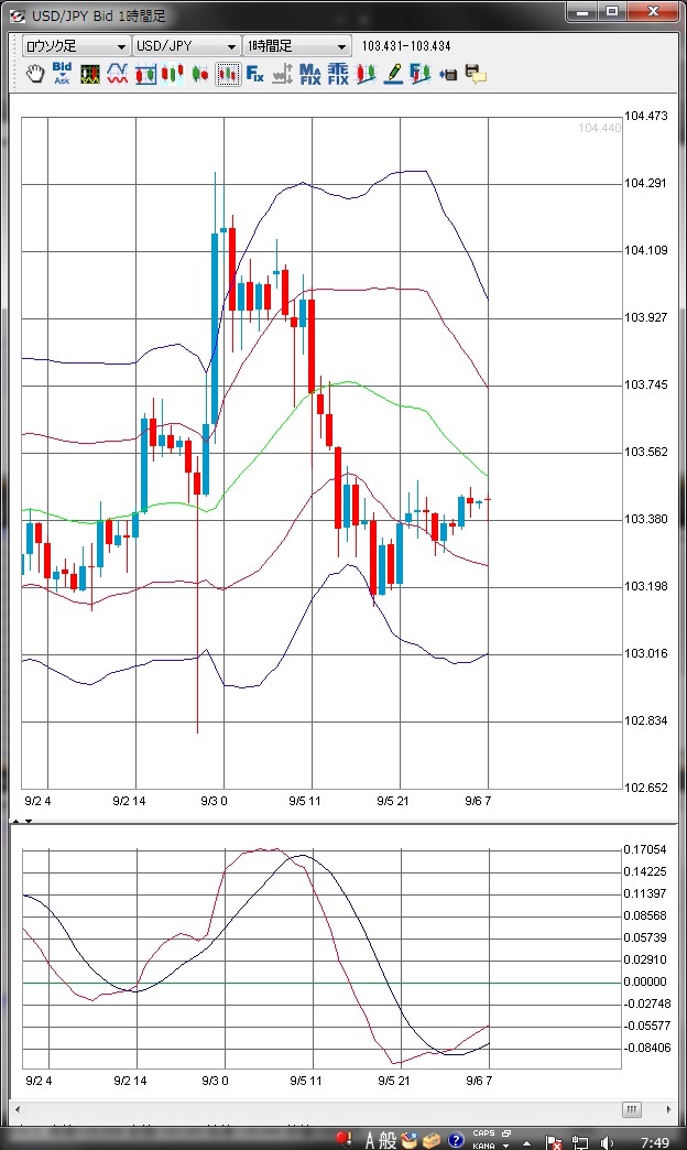 昨日のドル/円相場は、朝方は先週の流れを引き継ぎ104円台でスタートしたものの、軟調気味に推移し、正午前に伝わった黒田日銀総裁のコメントなどを受け、103円半ばに下落する動きとなりました。 黒田総裁は都内で講演し、金融政策で意識すべきなのは、限界ではなくコストとベネフィットの比較であるとの見解を示したものの、追加緩和をイメージさせる内容でなかったことがドル売りに繋がったと指摘されます。 この動きで、MACDは売り転換しており、欧州時間以降のドル売りを支持する形となっています。 欧州時間でも、ドル安流れが続き103円前半まで下落しています。 NY時間では、米国がレーバーデーの祝日のため米金融市場は休場であり、取引参加者も少なく、ドル/円は103円台前半で小動きが続きました。 103円水準では押し目買い意欲もあり、一段の下押しには繋がらず、MACDを見ても買い転換して引けていることから、本日東京時間でも103円台を維持した動きが続きそうです。 ※チャートは、ドル/円の1時間足ボリンジャーバンドMACDを表示しています。