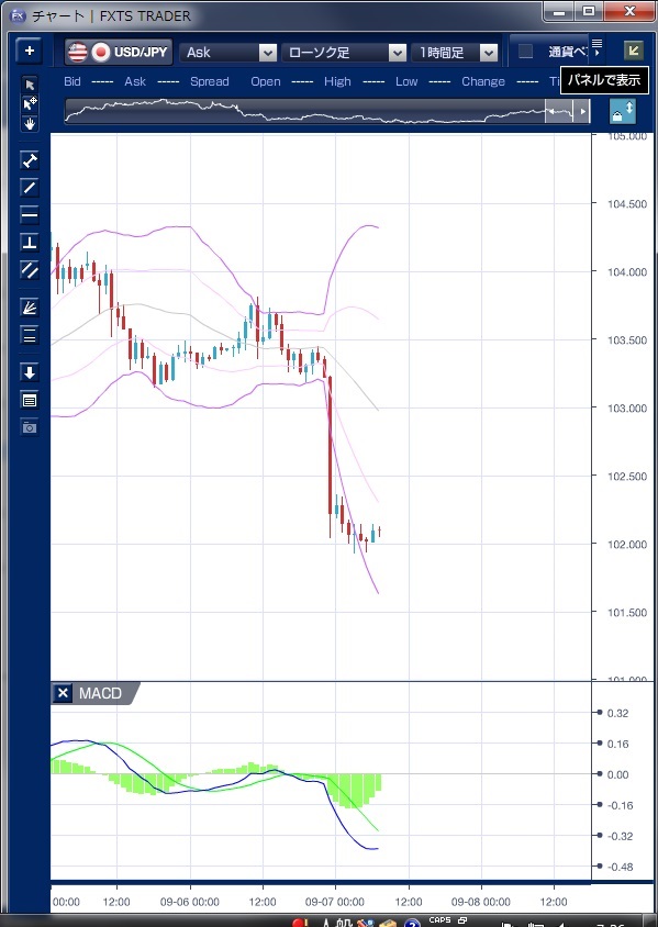 昨日のドル/円相場は、朝方はドルのショートカバーが先行し103円台後半まで値を戻したものの、正午前に一部報道で浜田内閣官房参与が「日銀は米連邦公開市場委員会(FOMC)前の追加緩和は控えるべき」との認識を示したと伝わったことを受け103円30銭水準まで急落しました。 その後、欧州時間スタートでは103円台前半での小動きが続きましたが、テクニカルで見るとこの時間帯にはMACDが既に売り転換しており、海外時間でのドルの下落を先取りしていたことがわかります。 NY時間に入り発表された8月の米ISM非製造業景況指数が51.4となり、前月の55.5から低下、市場予想の55.0も下回ったことを受けドル売りに流れが強まりました。 先週発表のISM製造業景況指数が既に悪化していたことに加え、先週末公表の雇用統計もさえない内容だったことから、米連邦準備制度理事会(FRB)が9月にも利上げに踏み切るのではないかとの観測が一段と後退したとの指摘があります。 この流れで、ボリンジャーバンドを一気にした抜き一時101円94銭まで下落しました。 ただし、FRBによる年内利上げの思惑は根強く残っており、ドルの押し目買い意欲も強いようです。 ※チャートは、ドル/円の1時間足ボリンジャーバンドMACDを表示しています。