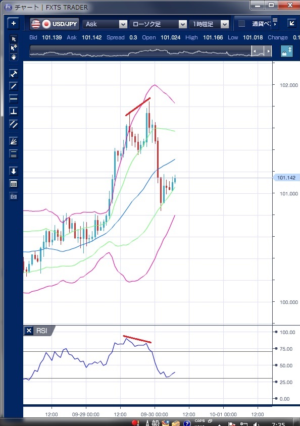 昨日のドル/円相場は、東京時間朝方からドル買いが優勢な動きとなりました。 石油輸出国機構(OPEC)による予想外の減産合意を受けリスク選好地合いが続き、日本株が上昇したこともあり、約1週間ぶりの高値圏に上昇しました。 朝の取引からボリンジャーバンドを上抜け、バンドウォークを示現しながら101円台を大きく回復していることが確認できます。 欧州時間に入ると、ドイツ銀行の経営不安を材料に調整が入ったものの101円台は維持し、NY午前では米国の4-6月期GDP確定値が予想を上回ったことや新規失業保険申請件数が予想を下回ったことを好感してドル買いが優勢となり、100円84銭まで上昇しました。 ただし、この上昇で高値を更新したものの、RSIは高値更新が出来ずに軟化しており、その後のドル下落を示唆する形となっていることがわかります。 NY午後には、顧客による信用供与縮小などの一部報道を受けてドイツ銀行の資本不足に対する市場の警戒感が再燃し、リスク回避の円買いが活発となって101円を割り込む動きとなり、101円水準でNYを引けています。 ※チャートは、ドル/円の1時間足ボリンジャーバンドRSIを表示しています。