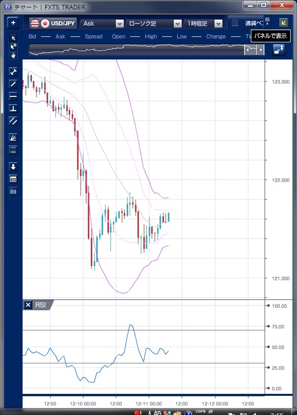 チャートは、ドル/円の1時間足ボリンジャーバンドRSIを表示しています。 昨日のドル/円相場は、東京時間では前日のドル急落の反動もあり、ドルのショートカバーが先行する動きとなりました。 ドル/円は一時121円75銭まで上昇したものの、日経平均が下落するのをにらみながら、リスク回避の動きが継続し、戻りの鈍い動きが続きました。 海外時間に入ると、米国の週次新規失業保険申請件数が予想を上回ったことを嫌ったドル売りが一時強まり121円25銭まで下落しましたが、その後、株式相場の上昇で安心感が広がり、来週のFOMCでの利上げが再び意識されるようになって121円67銭まで値を戻して引けています。 テクニカルで見ると、昨日は一昨日の急落の調整の動きであったことがわかります。 ボリンジャーバンドは一昨日の急拡大から一転して急速に縮まっており、そのバンドの中に相場が納まって動いています。 RSIも昨日の午前はドルのショートカバーを裏付けるように上昇していましたが、海外時間では中立水準での横ばいとなってきています。 原油価格の下落が米国の継続的な金融引き締めに影響を与える可能性が懸念されており、本日も原油相場と株式相場をにらみながら神経質な取引が続きそうです。
