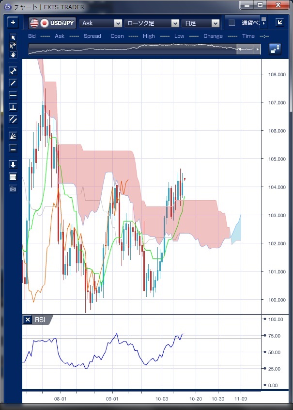 先週のドル/円相場は、ロシアのプーチン大統領がOPEC(世界石油輸出国機構)と協力し、原油生産調整に取り組む用意があるとしたことで原油価格が上昇しリスク・オンの流れとなったことや、第2回目の米大統領候補者による討論会でも、クリントン民主党候補の優勢は変わらなかったことを受け、ドルが上昇する動きとなりました。 13日には、7月末以来となる104円64銭まで上昇しています。 テクニカルで見ると、前週に一目均衡表の雲を上抜け、先週は実体が雲の上を推移していることで下値不安が遠のいた形となっています。 また、遅行スパンが日々線に同期しながら上昇してきたものが、先週後半には日々線の下落に逆行しており、相場が強気に転じてきていることが示唆されています。 また、9月2日の前回高値104円32銭を上抜けてきており、もう一段の上昇が期待される形となっています。 ただし、RSIが75を超えてきたおり短期的に買われ過ぎ水準にあることや、前回高値を上抜けても上昇に弾みがつかず鈍い動きとなっていることなどからは、短期的な調整の可能性もあり注意が必要でしょう。 上昇を続けた場合には、節目の105円を一気に抜けることが出来るかが注目されるところです。 ※チャートは、ドル/円の日足一目均衡表RSIを表示しています。