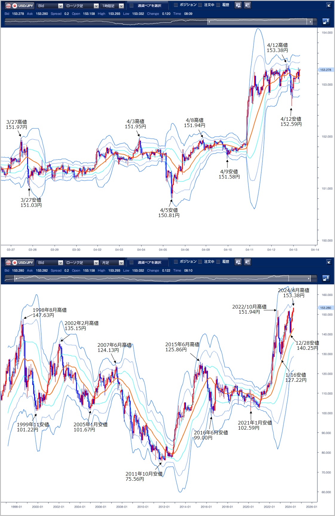 先週末(4月12日)のドル円は、3営業日ぶりに小反落。 中東の地政学リスクの高まりを受け、152.59円まで下落したものの、米金利早期利下げ観測の後退により153円台に値を戻す底堅い値動きとなりました。 東京市場は、下値が堅い。 東京仲値に向けた本邦輸出企業による実需のドル売りを受け、152.97円まで下落したものの、153円割れでは押し目買い意欲も旺盛で、153.27円まで値を戻す展開となりました。 欧州市場は上昇。 低下気味だった時間外の米10年債利回りが低下幅を縮小したことでドル買いが優勢となり、153.38円まで上昇し、1990年6月以来約34年ぶりの高値を更新しました。 NY市場は、下落後に反発。 「イランの報復攻撃が48時間以内にも行われるとみて、イスラエルは備えを進めている」との一部報道が伝わると中東の地政学リスクの高まりを受け、リスク回避の円買いが優勢となり、152.59円まで下落しました。ただ、ボスティック米アトランタ連銀総裁による「今年は年末にかけて1回の利下げ」「私は利下げを急いでいない」、デイリー米サンフランシスコ連銀総裁による「政策金利を調整する緊急性は全くない」との発言から、米金利早期利下げ観測が後退し、153.32円まで反発しました。 ===========================