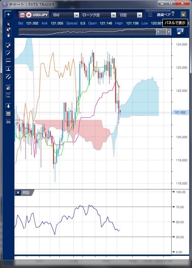 チャートは、ドル/円の日足一目均衡表RSIを表示しています。 先週のドル/円相場は、原油安によるインフレの低下懸念や株安がリスク回避の円買いに繋がり、週央には11月以降のボックス相場を下抜けて121円付近まで下落、さらに週末には国際エネルギー機関(IEA)のレポートを受けて原油価格が一段と下落したほか、ハイイールド、ジャンク債市場への警戒感が高まったことで120円59銭の安値をつけました。 今週の米利上げを既に市場は織り込んでいることから上値を追いにくかったこともドル下落の要因のひとつと指摘されます。 テクニカルでは、ドルの上昇基調が一旦打ち消された形となっています。 一目均衡表の転換線が基準線を下回り、遅行スパンは陰転、相場は先行スパンの雲の中に入ってきてしまっています。 122円〜124円のレンジをクリアーに下抜けてしまったことで、この水準が上値抵抗となり上値を重くしています。 今週は、米連邦公開市場委員会(FOMC)での利上げが確実視されていますが、声明文と同時に公表される米連邦準備理事会(FRB)の物価・成長見通しやその後のイエレンFRB議長の会見内容に注意したいところです。 原油の一段安や鈍い賃金動向、景況感の鈍化から利上げペースの鈍化が意識されると、ドルに対するリスクが高くなるといえそうです。 この場合、米利上げを見込んで投機筋を中心に積み上げてきたドルロングを年内に圧縮する動きが強まる可能性もあり、FOMC後もドル売りが継続される可能性もあるでしょう。