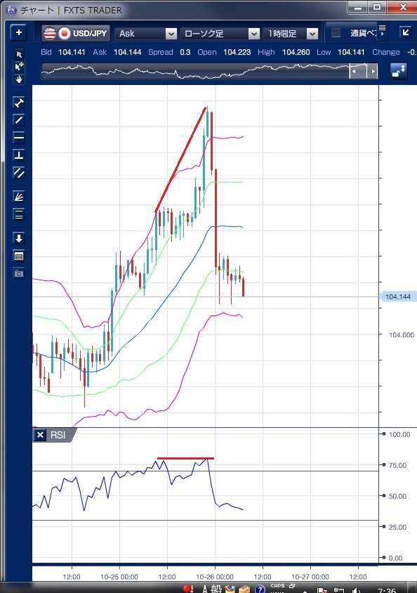 昨日のドル/円相場は、アジア時間から欧州時間にかけて104円台前半で底堅く推移したものの、104円半ばを一気に上抜ける勢いはなく、小動きが続きました。 NY時間に入ると、サンフランシスコ連銀のウィリアムズ総裁が、米紙ウォール・ストリート・ジャーナルとのインタビューで、「追加利上げの最適な時期は12月の連邦公開市場委員会(FOMC)」との見解を示したことが伝えられるなど、年内利上げが一段と織り込まれる形となり、一時104円87銭まで上昇し、約3カ月ぶりの高値を付けました。 しかし、この流れでボリンジャーバンドを上抜けたもののバンドウォークには繋がらず、またRSIを見ても価格の上昇にもかかわらず横ばいでダイバージェンスを形成しており、このドル上昇がトレンドとはならず反落の可能性があることを示していました。 実際その後に、米長期金利が低下に転じたほか、10月のコンファレンス・ボード消費者景気信頼感指数が低下するなど、ドル買いに水を差す材料が浮上し、ドル上昇が失速、一気に104円台前半に押し下げられています。 ドル/円は7月29日以来の高値に上昇したものの一過性の動きにとどまっており、NY引けにかけては見慣れた水準に戻ってきてしまっています。 原油先物価格や欧米株が下落したこともあり、本日も東京時間でも104円半ばから上値の重い状況は続きそうです。 ※チャートは、ドル/円の1時間足ボリンジャーバンドRSIを表示しています。