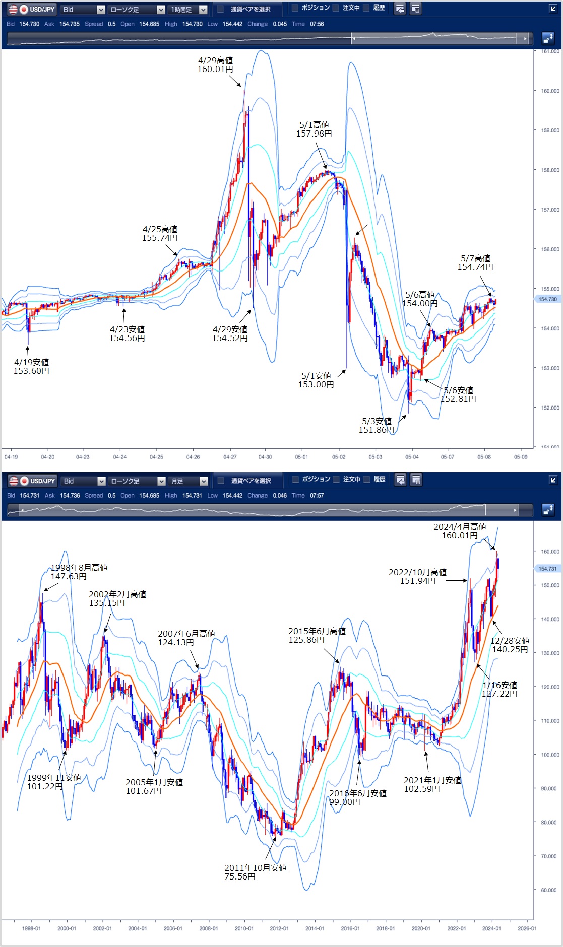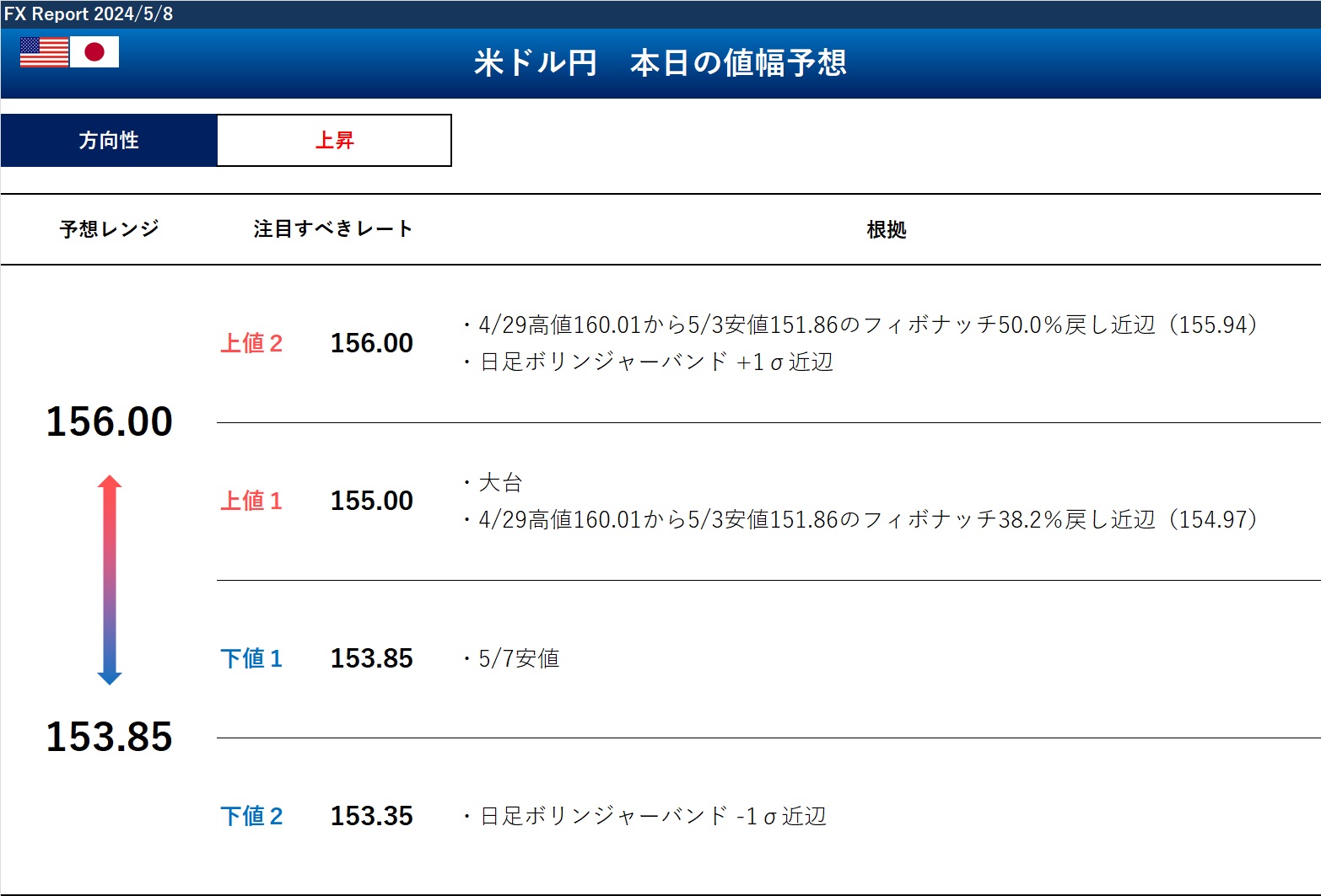 昨日(5月7日)のドル円は、2日続伸。 日米金利差を意識したドル買い円売りが優勢となり、154.74円まで上昇しました。 東京市場は、上昇。 連休明けの日経平均が反発し、上げ幅を550円超高まで拡大したことを受け、リスク選好の円売りドル買いが優勢となり、153.85円から154.65円まで上昇しました。 欧州市場は、下値が堅い。 「植田日銀総裁が岸田首相と意見交換のために官邸入りをした」との一部報道が伝わると、介入警戒感の高まりを受けてドル売り円買いが優勢となり、153.98円まで下落しました。その後、意見交換は定例のもので、踏み込んだ議論がされなかったことがわかると、154.63円まで反発しました。 NY市場は、続伸。 週末のイエレン米財務長官の介入けん制発言を受けて「政府・日銀が断続的に為替介入を行うのは困難」との見方から、日米金利差を意識したドル買い円売りが優勢となり、日通し高値となる154.74円まで上昇しました。引けにかけて小反落するも下値は堅く、154.69円でNYをクローズしています。 ===========================