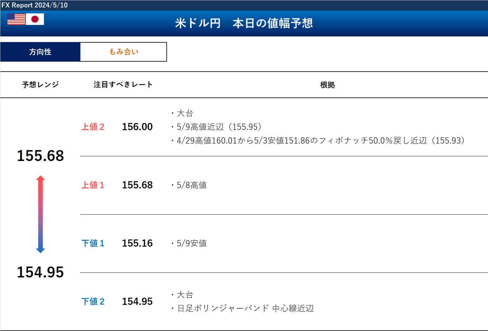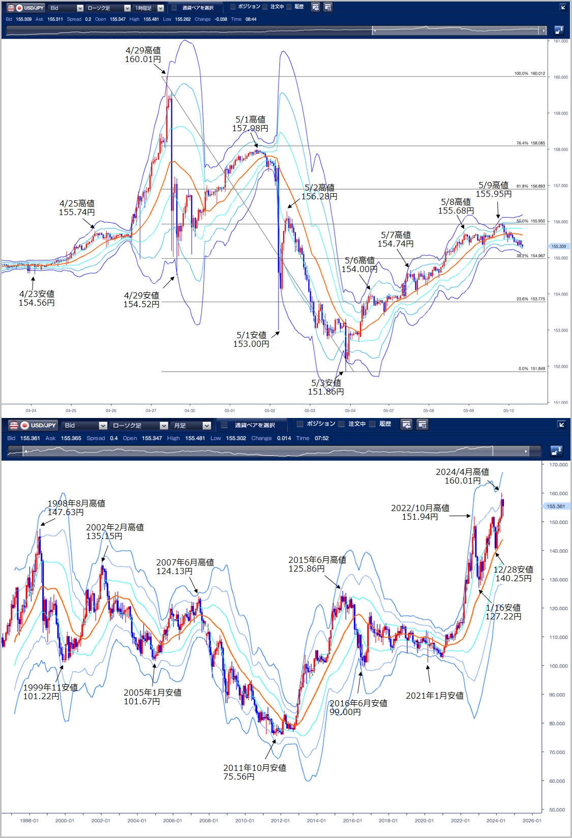 昨日(5月9日)のドル円は、上昇後に反落。 米長期金利の上昇を受け、155.95円まで上昇したものの、米労働指標の弱い結果にドル売りが優勢となり、155.35円まで下落する展開となりました。 東京市場は、底堅い。 日銀金融政策決定会合における主な意見(4月25-26日分)が公示され、「円安を背景に基調的な物価上昇率上振れが続く場合、正常化ペース速まる可能性十分ある」などの見解が示されると、日銀による追加利上げ観測から円買いドル売りが優勢となり、155.16円まで下落しました。 ただ、その後は実需目的のドル買いを受け、155.69円まで値を戻す底堅い値動きとなりました。 欧州市場は、上昇。 時間外の米10年債利回りの上昇を受けたドル買いが優勢となり、155.95円まで上昇しました。 NY市場は、反落。 米新規失業保険申請件数(予想21.2万件 結果23.1万件)の市場予想を下回る結果を受け、米10年債利回りの低下とともにドル売りが優勢となり、155.35円まで下落する展開となりました。 ===========================