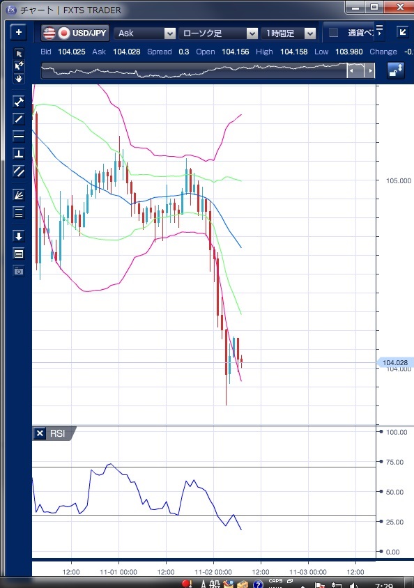 昨日のドル/円相場は、東京時間は104円台後半での小動きが続きました。 日銀金融政策決定会合の結果は市場の予想通り現状維持となったため相場に影響はありませんでした。 欧州時間に入ると、スタートはドルが強含み105円台を回復しましたが、その後は徐々に軟化する動きとなりました。 さらにNY時間に入ると、9月の米建設支出が前月比0.4%減と市場予想に反し2カ月連続のマイナスとなったことから第3四半期の米GDPは下方修正されるとの見方が強まりドル売りが優勢の展開で、一時103円80銭まで下落しました。 大統領選の一部世論調査でトランプ氏優勢との報道が市場の警戒感を強めリスク・オフのムードが広がったこともドル安の要因となったとの指摘もあります。 この流れで、ボリンジャーバンドの下抜けが起き、強いバンドウォークの動きが確認できます。 その後、NY引けにかけて104円台を回復していますが、ボリンジャーバンドは拡大を続けており、相場の下落の勢いは継続しているように見えます。 本日の東京時間もリスク・オフの流れが続き104円台前半は上値の重い動きが予想されます。 ※チャートは、ドル/円の1時間足ボリンジャーバンドRSIを表示しています。