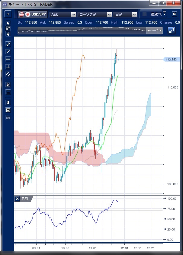 先週のドル/円相場は、前週の流れを引き継ぎ、終始ドルが堅調な地合を続けました。 トランプ次期政権下でインフレが進行し、米長期金利は大幅に上昇するとの思惑が広がっていることや、米国株が過去最高値を更新したことを好感したドル買いなどにより、一時113円90銭の高値をつけました。 ただし、週末には28日に予定されていた石油輸出国機構(OPEC)加盟国と非加盟国の協議が中止となったことが伝わり、30日のOPEC総会で減産合意は微妙な状況となったことを受けて、リスク選好的なドル買い・円売りは一服となり、112円台半ばまで緩む局面がありました。 テクニカルで見ると、一目均衡表では三役好転が続いており、ドルの上昇トレンドが明確な動きとなっています。 昨年6月の高値125円85銭から本年6月の安値99円までの押しの50%戻しである112円50銭水準をクリアーに上抜けたことで、61.8%戻しである115円70銭水準が視野に入ってきています。 もっとも、短期的には急激に買われすぎていることも事実で、日足ベースのRSIは2012年からのドル上昇局面と比較しても最高値となっており、短期的な調整の可能性が示唆されています。 今週もドル/円は底堅い動きを続けそうで、短期の調整が入ったとしても、押し目買いを待っている市場参加者が多いために、下値は限られたものとなってしまいそうです。 ※チャートは、ドル/円の日足一目均衡表RSIを表示しています。