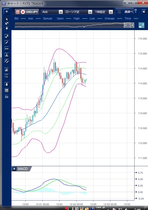 昨日のドル/円相場は、東京時間朝方こそドルは上値追いとなり114円83銭まで上昇しましたが、その後は利益確定売りに押されて次第に上値が重くなり、114円を挟んだもみ合いに移行しました。 MACDを見ると、東京時間には売り転換しており、ドルの上昇が一服した可能性を示唆しています。 欧州時間に入ると、ドルは反発しじりじりと値を上げる動きとなり、NY午前中には11月の米サプライ管理協会(ISM)製造業景況指数が予想以上に改善したことを受けて、114円73銭まで値を戻しました。 この上昇で、ボリンジャーバンドのアッパーバンドにタッチしましたが、バンドウォークには繋がらず、一過性の上昇であることが示されています。 その後は、米雇用統計を控えポジション調整のドル売りが持ち込まれたことや原油価格がNY引けにかけて反落したことなどから、ドルも軟調な動きとなり、114円台前半まで値を下げてNYを引けています。 昨日の値動きを見ると、東京時間の114円83銭とNY時間の114円73銭でダブルトップを形成しているようにも見え、昨日の安値113円83銭水準をクリアーに下抜けると、もう一段下値余地が広がる可能性があることには留意が必要といえそうです。 ※チャートは、ドル/円の1時間足ボリンジャーバンドMACDを表示しています。