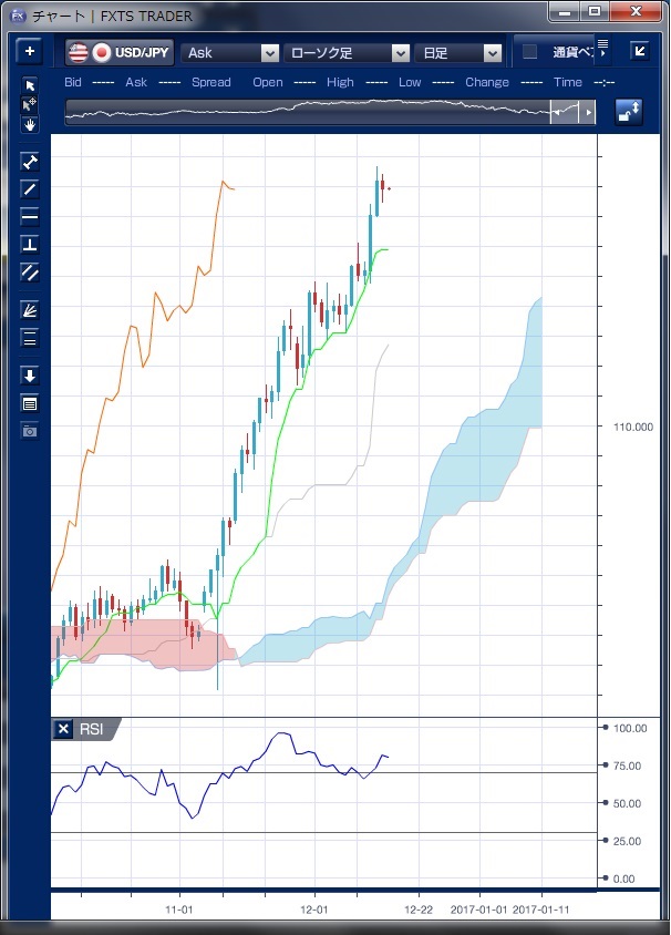 先週のドル/円相場は、週初こそ前週のドル上昇に対する利食いのドル売りで上値の重い動きとなりましたが、13-14日に開かれた米連邦公開市場委員会(FOMC)の会合で予想通り0.25ポイントの利上げが全会一致で決定され、2017年末の政策金利予測が9月時点の1.1%から1.4%に引き上げられていたなど、予想以上にタカ派的な見通しが出されたことを受けて、リスク選好的なドル買いが急速に広がり、一時118円66銭まで買い進まれる動きとなりました。 その後は、米国債利回りの上昇が一服したことや日本の長期金利上昇を意識してリスク選好的なドル買いは一段落し、週末のNY時間では11月の米住宅着工件数が予想を大きく下回ったことや、中国海軍が米国の無人潜水機を拿捕したとの報道を受けてドルは伸び悩み、118円を割れて週を越えています。 テクニカルで見ると、ドルの一本調子の上昇はまだ続いており、一目均衡表の三役好転にも変化はありません。 ただし、RSIが再び上昇してきているものの、11月24日の高値を上抜いておらず、価格とのダイバージェンスが残っていることは気になるところです。 ドル高が急ピッチに進んだことで、ドル高に対する警戒感は強まっており、クリスマス休暇前のポジション調整を期待する声もあります しかし、クリスマス休暇に入る数日前までは、投機的な動きを続けるとの見方も強く、安易なドル売りはリスクが高いといえそうです。 ※チャートは、ドル/円の日足一目均衡表RSIを表示しています。