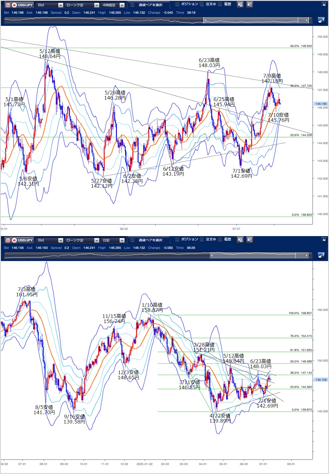 4時間足のボリンジャーバンドは中心線が上向きですが、バンド幅が収斂しており、もみ合いを示唆しています。日足のボリンジャーバンドは、中心線が上向きとなっており、上昇を示唆しています。