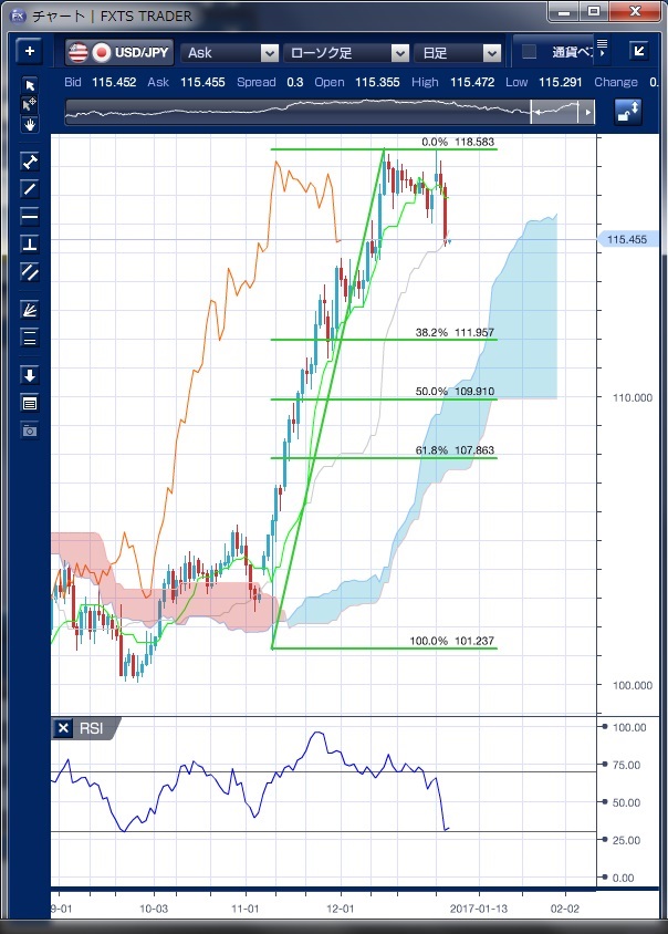 昨日のドル/円相場は、当居時間朝方こそ117円台で推移していたものの、その後は新規材料難のなか、短期筋によるドルロングの調整を中心にしたドル売りが広がり、115円台半ばまで軟化する動きとなりました。 欧州時間に入ると、ドルは底堅さを持ち直し116円台後半に反発しました。 しかし、NY時間に入り発表された12月の米ADP雇用統計で民間雇用者数が15.3万人増と市場予想を下振れしたことを受け、再びドル売り圧力が強まり、一時115円21銭と約3週間ぶりの安値をつけました。 テクニカルで見ると、118円台後半でダブルトップが形成されており、米大統領戦後初めて20日移動平均線を割り込んだことなどから、トランプ・ラリーが終了した可能性が示唆されています。 一目均衡表の遅行スパンの売り転換が起きれば、ラリー終了が確認されたこととなり、その場合の押しのめどは、昨年11月9日の安値(101円20銭)から12月15日の高値(118円68銭)の38.2%戻し水準にあたる112円ちょうど近辺となりそうです。 ただし、本日には米雇用統計が控えており、20日移動平均のある116円80銭水準を上抜けることが出来れば、再度118円後半の高値超えを試す動きとなるでしょう。 ※チャートは、ドル/円の日足一目均衡表、20日SMARSIを表示しています。