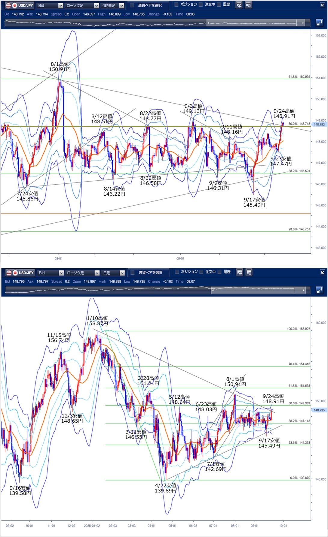4時間足および日足のボリンジャーバンドは、中心線が上向きでエクスパンションを形成しており、強い上昇を示唆しています。