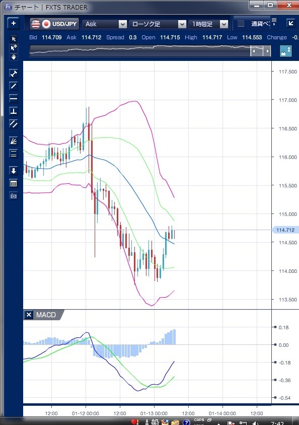 昨日のドル/円相場は、前日のトランプ次期米大統領の会見の影響を引き継ぎ、ドルが軟調な推移となりました。 東京時間では、新たな材料のない中、115円台からじりじりと値を下げる動きとなり、欧州時間には昨年12月8日以来のドル安・円高水準である113円75銭まで下落しました。 その後は、113円台では押し目買い意欲も強かった模様で反発し、114円を回復しました。 この上昇で、MACDが買い転換していることが確認できます。 NY時間に入るとドルは再び軟化し、113円81銭まで下落する動きとなりました。 ただし、この下落でもMACDは転換することなく、その後のドルの戻りを示唆していました。 NY時間後半では、NYダウの下げ幅縮小や米債利回りの低下が一段落したため、ドル売りは後退し、114円台後半まで反発して引けています。 113円台でダブルボトムをつけた形となっており、トランプ会見を嫌気したドル売りの流れは一服したように見えます。 本日東京市場で115円台を回復できるかが注目されます。 ※チャートは、ドル/円の1時間足ボリンジャーバンドMACDを表示しています。